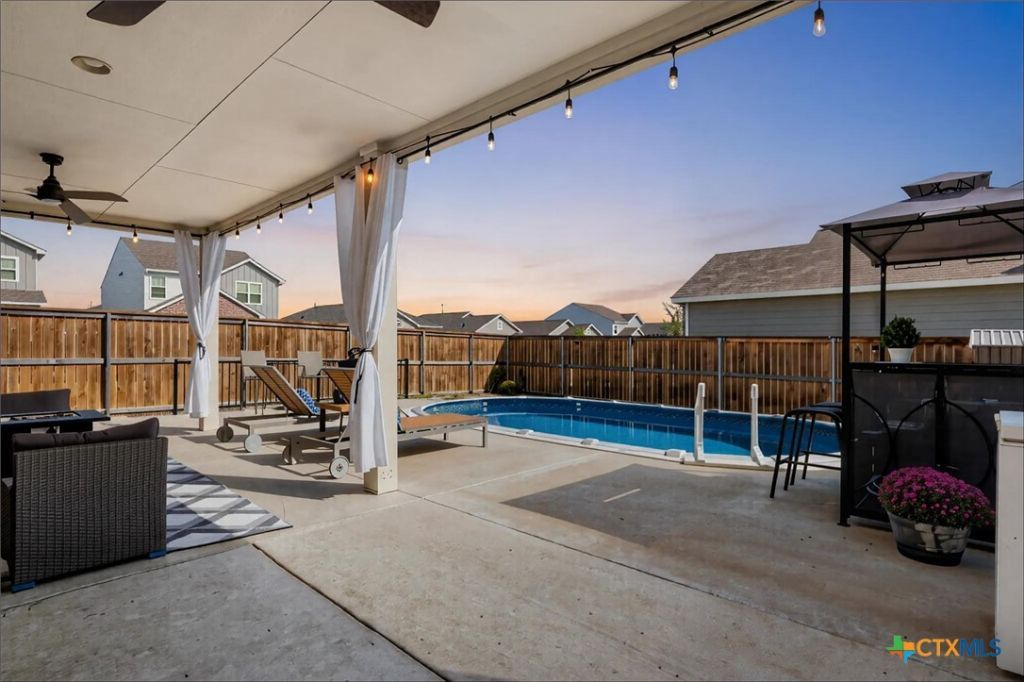 If youve been dreaming of your own private backyard oasis, this is your opportunity. This beautiful almost new home with a lot of upgrades already, features a Private Pool and a large covered patio, perfect for relaxing, entertaining, and enjoying the Texas sunshine almost year-round. Welcome to this gorgeous 3-bedroom, 2.5-bath home fully furnished, perfectly situated on a spacious corner lot in a quiet, friendly neighborhood?just 5 minutes from I-35 for easy commuting and access to nearby shopping and dining. Step inside and fall in love with the open-concept layout, ideal for both everyday living and entertaining. The inviting living area flows seamlessly into a bright kitchen and dining space, creating a warm and connected feel. Upstairs, you'll find a second living room or flex space, perfect for a home office, playroom, or media area. Granite countertops in kitchen and quartz countertops in bathrooms, and the real highlight backyard oasis ? featuring a semi-inground pool, extended concrete patio, and a large covered patio, offering plenty of room for gatherings, relaxation, and year-round enjoyment, and if you need more space... an A/C split unit was installed in the garage so it could easily be used as an office, gym or a cave man. This home combines comfort, convenience, and style in one beautiful package ? a true gem in the growing community of Jarrell, TX. If youve been waiting for the right time, this is it! Schedule your showing and come see what life could look like here!