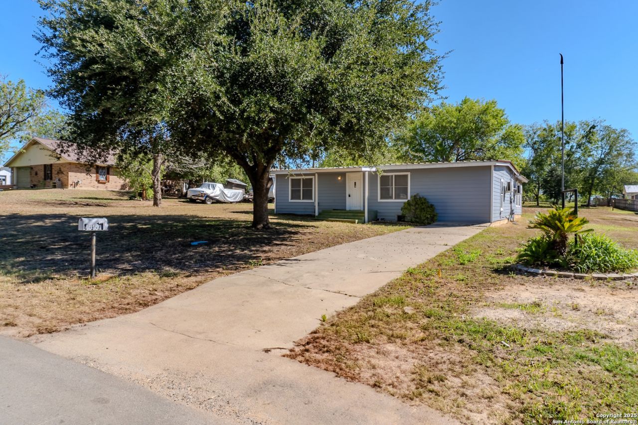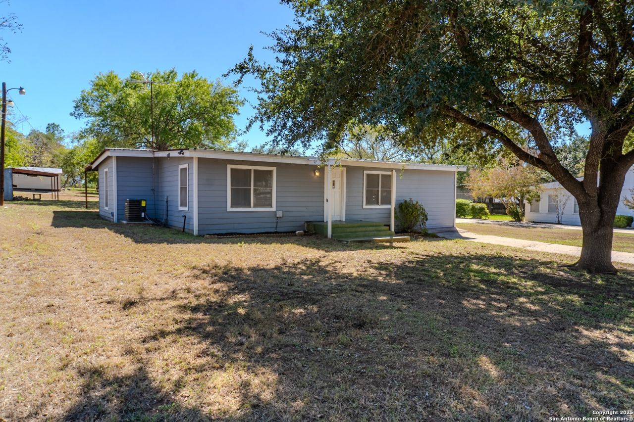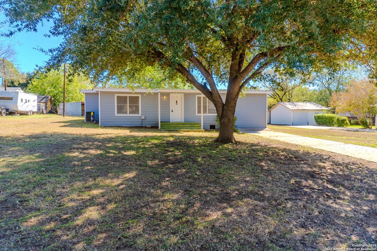 PRICE IMPROVEMENT! This charming, move-in-ready single-story home offers incredible value just minutes from downtown Floresville. Featuring 3 bedrooms, 2 baths, and two living areas across 1,442 sq ft, the home sits on a generous 0.48-acre lot shaded by beautiful mature trees. Enjoy wood floors throughout (no carpet), fresh interior and exterior paint, a new gas stove, metal roof, and cement fiber siding. Recent upgrades include a new HVAC system (Sept 2025) plus a mini-split in the primary bedroom/flex space for added comfort. The expansive backyard with a covered patio is perfect for relaxing, entertaining, or future expansion. A detached structure provides flexibility for a carport, workshop, or storage. Conveniently located near El Camino Trail, Pecan Park, and River Park, and just 20 minutes from San Antonio, this home offers space, updates, and location at an exceptional price.