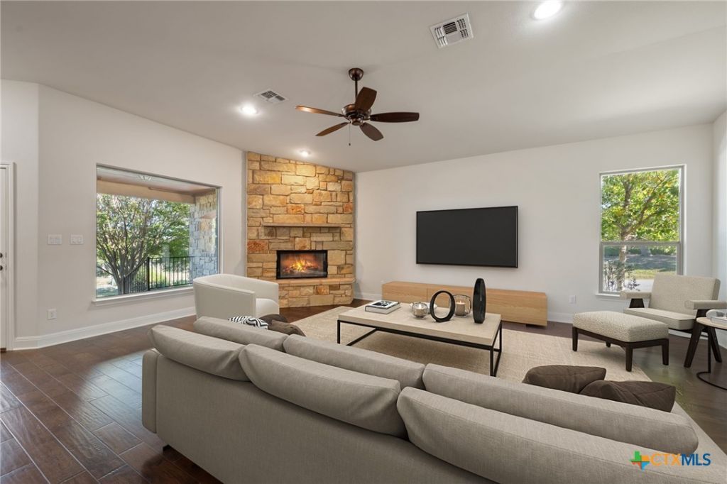 Discover the perfect fusion of single-level convenience and sophisticated luxury in this rare Lakeway find. Designed for effortless living and elegant entertaining, this stunning residence boasts a highly sought after open floorplan featuring three bedrooms, two and a half bathrooms, and a dedicated private office all in a single floor large corner lot. From the moment you step inside, with all new interior paint you are greeted by an atmosphere of refined comfort. Gleaming hardwood floors flow seamlessly through the bright and airy living spaces, illuminated by custom, designer-selected lighting. The heart of the home is the magnificent great room, anchored by a dramatic floor to ceiling stone fireplace that creates a captivating focal point for gatherings. The gourmet kitchen is a chef's dream, thoughtfully appointed with rich granite countertops, premium stainless steel appliances, and ample cabinetry. It opens directly to the dining and living areas, ensuring you're always part of the conversation. Transition effortlessly from indoor refinement to your private outdoor oasis. The spectacular covered patio offers an exceptional, shaded living space for alfresco dining, morning coffee, or simply relaxing while overlooking your serene backyard. This home isn't just a residence; it's a passport to an unbeatable lifestyle. As a resident, you'll enjoy exclusive access to a beautiful community swimming pool, tennis courts, and a basketball court. Beyond the community, you are just moments away from Lakeway Park and the Marina. Spend your weekends boating on Lake Travis, hiking the scenic trails, or enjoying the parks, all just minutes from your front door. With its rare single story design, high end finishes, and prime location, this home offers a resort style living experience every day. Do not miss this exceptional opportunity. Schedule your private showing today!