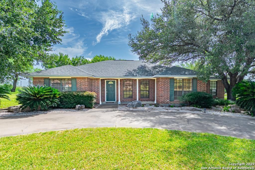 Located West of Pettus , this beautiful home sits on 2 lots, is landscaped , has mature oak trees and a lush yard. A circle drive in front welcomes your guest while the concrete drive to the side garage includes extra parking for an RV. The split floor plan is centered with spacious living room complete with high ceilings and a wood burning fireplace. The dining area provides the room needed for those holiday gatherings and is steps away from the kitchen and breakfast area. An array of windows allows a serene view of the shaded yard while cooking or enjoying an intimate dinner for two. Thoughtful design is reflected in the primary suite with garden tub and shower. The 2 car attached garage is complete with a storage and separate workroom. This home is supplied utilities from the local Municiple Utility District but also has a water well which supplies water for the sprinkler system. A private patio and electrical connection for RV are just a few extras that await you at this immaculate maintained home on .68 of an acre.; Original MLS#: 113471; Deed Restrictions: Yes; Features: Porch-Covered; Home Warranty: No; Land Dimensions: .688; Land Size Apx: .688; Water District: Yes; Water Heater: Electric; Windows: Thermal; Zoning: None