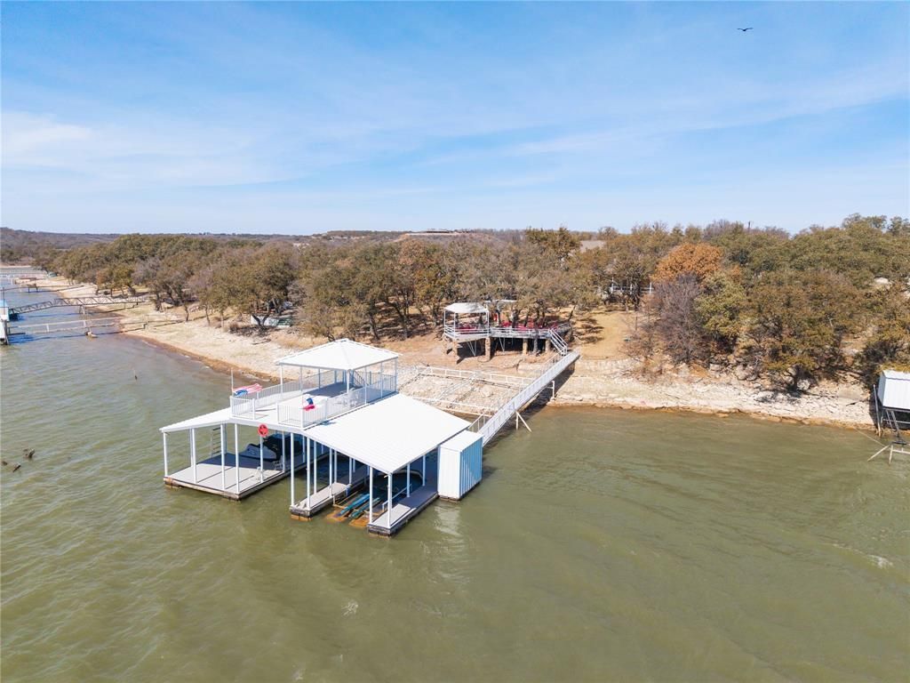 Deep-watered, fully-furnished Dominion Point lake-front home on beautiful Lake Brownwood! Bring all the family and friends! There's plenty of room with five bedrooms, three baths and lots of outdoor entertaining areas including a spacious composite-board deck cantilevered over the water. The fully-landscaped yard - completely shaded by mature live oaks - includes a sprinkler system, built-in gas grill and 12' x 12' storage building with covered chain-linked fenced dog pens. And the gently-sloping flagstone walk provides easy access to the 30' x 48' two-slip aluminum dock with Hydro-Hoist lift, two floating jet ski ports, roomy storage closet and 17' x 30' covered sun deck. The dock floats in an estimated 18 to 20 feet of water when the lake is full. The two-story rock home includes three bedrooms (including the primary), two baths, living-dining, wood-burning fireplace, kitchen and utility room downstairs complimented by two bedrooms and a jack-n-jill full bath upstairs. All three downstair bedrooms open through French doors to a covered flagstone porch and scenic easterly views of the lake. The primary and guest baths downstairs include granite counter tops with tiled counter tops in the kitchen. The living area, kitchen, bathrooms and utility are floored in ceramic tile and all five bedrooms are fully carpeted. Park your car and golf cart securely in the two-car attached garage with electric door opener. Come home to this inviting lake-front property and stay awhile. Slow down, take your shoes off and enjoy the quiet serenity of lake living.