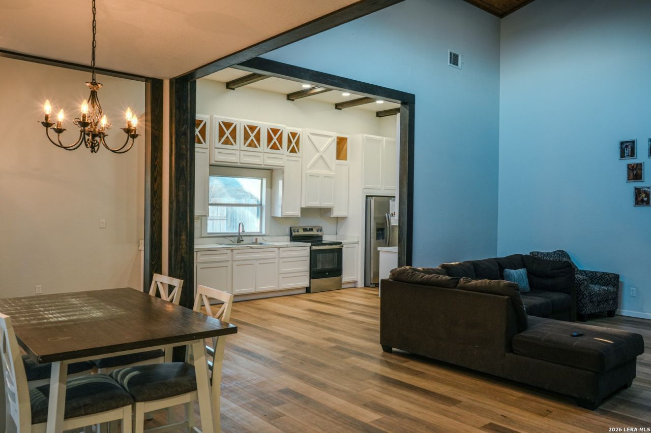 Discover this stunning 4 bedroom, 2 bath home offering an open concept layout and soaring ceilings that create a bright, expansive feel throughout. Designed with both elegance and functionality in mind, the spacious living area flows seamlessly into the dining and kitchen spaces ideal for everyday living and entertaining. A dedicated office provides the perfect work from home setup or flexible bonus space. The private primary suite features a generous walk in closet and a well appointed ensuite bath. A thoughtfully separated secondary bedroom wing offers added privacy, making it ideal for guests or multi generational living. Located in the heart of Uvalde, this home offers convenient access to local schools, shopping, dining, and everyday amenities. Enjoy being just minutes from downtown Uvalde, with its charming local businesses and community events, as well as nearby outdoor recreation including parks, rivers, and scenic Texas Hill Country views. This property delivers the perfect blend of comfort, versatility, and location all on one level.