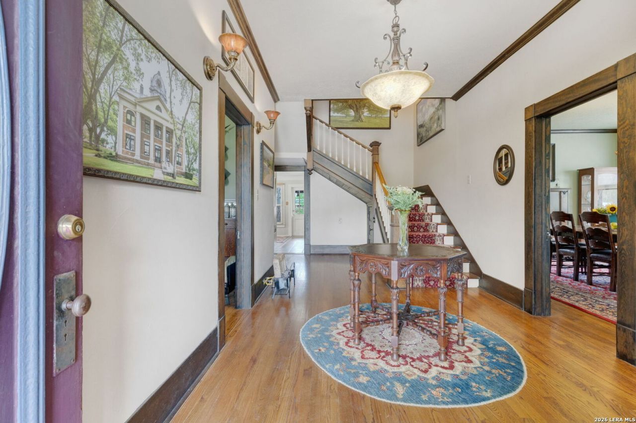 Step into timeless elegance in this architecturally significant 1909 Plains Victorian, beautifully blending historic charm with modern comfort. Set on nearly half an acre, this meticulously restored four-bedroom, four-bath home is truly move-in ready. The homes commanding exterior and classic lines evoke a bygone era. Inside, a grand foyer opens to a welcoming parlor and formal dining room, connected by original longleaf pine pocket doors-ideal for entertaining. Oversized rooms feature soaring 12-foot ceilings and original longleaf pine and quartersawn oak woodwork, including crown molding and 10-inch baseboards. The spacious kitchen offers granite countertops, motion-sensor lighting, and premium appliances, including a Bosch dishwasher, hammered copper farm sink, GE gas range, and French door refrigerator. Upstairs, three large bedrooms each include en suite baths with period-appropriate finishes. A fourth en suite bedroom downstairs, with private exterior access, is perfect for guests or multi-generational living. Outdoors, six mature pecan trees shade the beautifully maintained grounds. The privacy-fenced backyard features irrigation, motion-activated lighting, and a covered pavilion for relaxed evenings. A 670 sq ft outbuilding includes a porch, paneled studio, and workshop with roll-up access. Extensive upgrades include new HVAC with air purification, updated ductwork, plumbing, electrical, on-demand water heaters, whole-house water filtration, high-speed fiber internet, and foam insulation. This exceptional property offers the romance of historic living with all the conveniences of today.