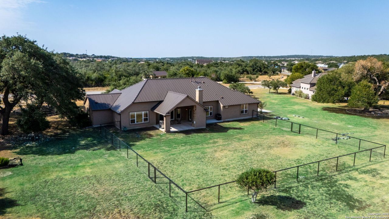 Hill Country elegance meets everyday comfort in this beautifully designed one-story home nestled on a level 1.27 acre lot with mature oak trees in the sought-after Vintage Oaks community. Boasting 3,190 sq. ft., this spacious 4-bedroom, 3-bathroom layout features soaring ceilings, an open-concept design, and an inviting living room with French doors. The gourmet kitchen is a chefs dream with custom cabinetry, granite countertops, stainless steel appliances, a warming oven, and an oversized hidden butlers pantry. The private primary suite offers a spa-like bath with a walk-in shower and garden tub. Enjoy the Texas lifestyle on the expansive covered patio complete with a gas/wood-burning fireplace-perfect for entertaining or quiet evenings under the stars. The oversized 3-car garage includes a utility sink for added convenience. Just a short stroll to the resort-style pool and amenities of Vintage Oaks-this is the home youve been waiting for.