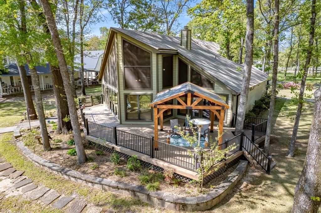 Lake Fork Gem! Stunning lakefront home sitting on two lots in the desirable Brook Harbor subdivision, Yantis, Texas. Towering trees and exquisite landscaping surround this warm wood-sided home that blends seamlessly into the natural setting, providing unforgettable warmth and character. The main residence features 3 bedroom and 2 bathroom complemented by a massive rustic den, a spacious kitchen, cozy breakfast nook, formal dining and spacious Trex decking across the back deck overlooking the lake, perfect for both relaxed living and entertaining. Designed with comfort and versatility in mind, the property also includes a detached oversized 2-car garage with an upstairs guest suite offering 2 bedrooms, 1 bathroom, a full kitchen, and living room, providing ample accommodations for family and visitors with over 2400 square feet of purposeful living space. Think Big Cedar Lodge! Outdoors, the property transforms into an entertainer’s dream. A covered upgraded outdoor kitchen measuring 24 x 30 and fire pit sets the stage for unforgettable gatherings. The enclosed 35 x 50 shop offers exceptional storage or workspace options. Enjoy direct lakefront access with a covered boat slip and dock, 29 x 32 Trex, ideal for boating, fishing, or simply soaking in breathtaking sunsets. Gated entry and winding driveway create a grand entrance, enhancing the property’s secluded, resort-like feel. Offered as a true turn-key opportunity, this home, which sits on two parcels, conveys with furnishings, glassware, and silverware—making it completely move-in ready. Experience the perfect blend of rustic luxury, privacy, and lakeside living in this extraordinary East Texas retreat.