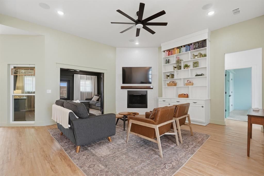 Welcome to this beautiful 4-bedroom, 2-bath home designed with comfort, style, and functionality in mind. The open-concept layout creates a seamless flow throughout the main living spaces, while a dedicated office or flex space just off the living room offers the perfect spot for working from home, a playroom, or additional entertaining space.The living room is warm and inviting, featuring a wood-burning, complemented by built-in bookshelves and storage for added character and convenience.The kitchen offers a fresh, clean aesthetic with white cabinets, countertops, and a matching backsplash, creating a bright and timeless look. A large eat-at island provides plenty of space for gathering.The primary retreat is generously sized and thoughtfully designed, featuring a private ensuite with a soaking tub, separate shower, dual vanities, and a walk-in closet that conveniently connects to the laundry room.The three additional bedrooms are all spacious and versatile.Step outside to a beautifully landscaped backyard complete with an oversized sitting area, ideal for relaxing or entertaining. The property also includes RV parking and a shop, offering plenty of space for storage, projects, or recreational needs.With its thoughtful layout, modern finishes, and exceptional outdoor features, this home truly has it all!