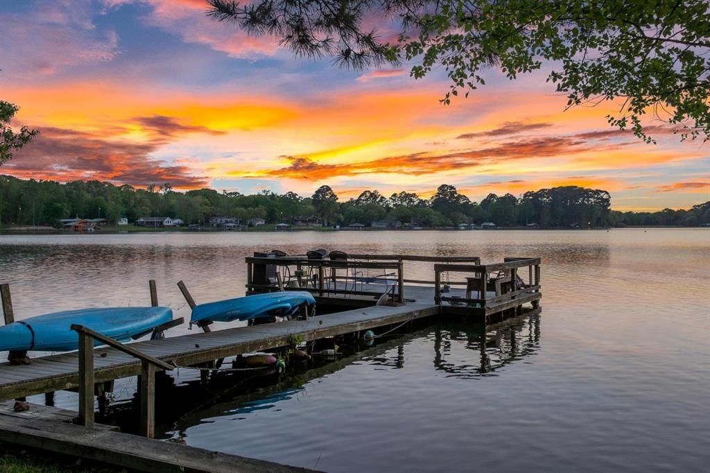 One of the premier sites at Lake Lydia, this property has wide open water views and is west-facing for taking in gorgeous East Texas sunsets. Lake Lydia is a private 100 acre spring-fed lake, known for stellar fishing and ideal for pontoon cruises, paddle boarding, and kayaking. This house is available for the first time in 30 years. It features 2 bedrooms and 2 full bathrooms on the main level, and a guest suite with a full bathroom, living area, and kitchenette on the basement level. The main level has views of the water from almost every room, an open concept, vaulted ceilings in the living room, and a screened porch across the width of the house. The guest suite has a separate drive, carport, and a private entrance. The property features a dock with composite decking and an enclosed boathouse with two boat slips. An oversized garage with room for parking two vehicles, a golf cart, riding mower, and room for a workshop is a definite bonus at Lake Lydia. Exceptional views in a pinewoods setting on one of East Texas' best kept secrets, less than two hours from Dallas.
