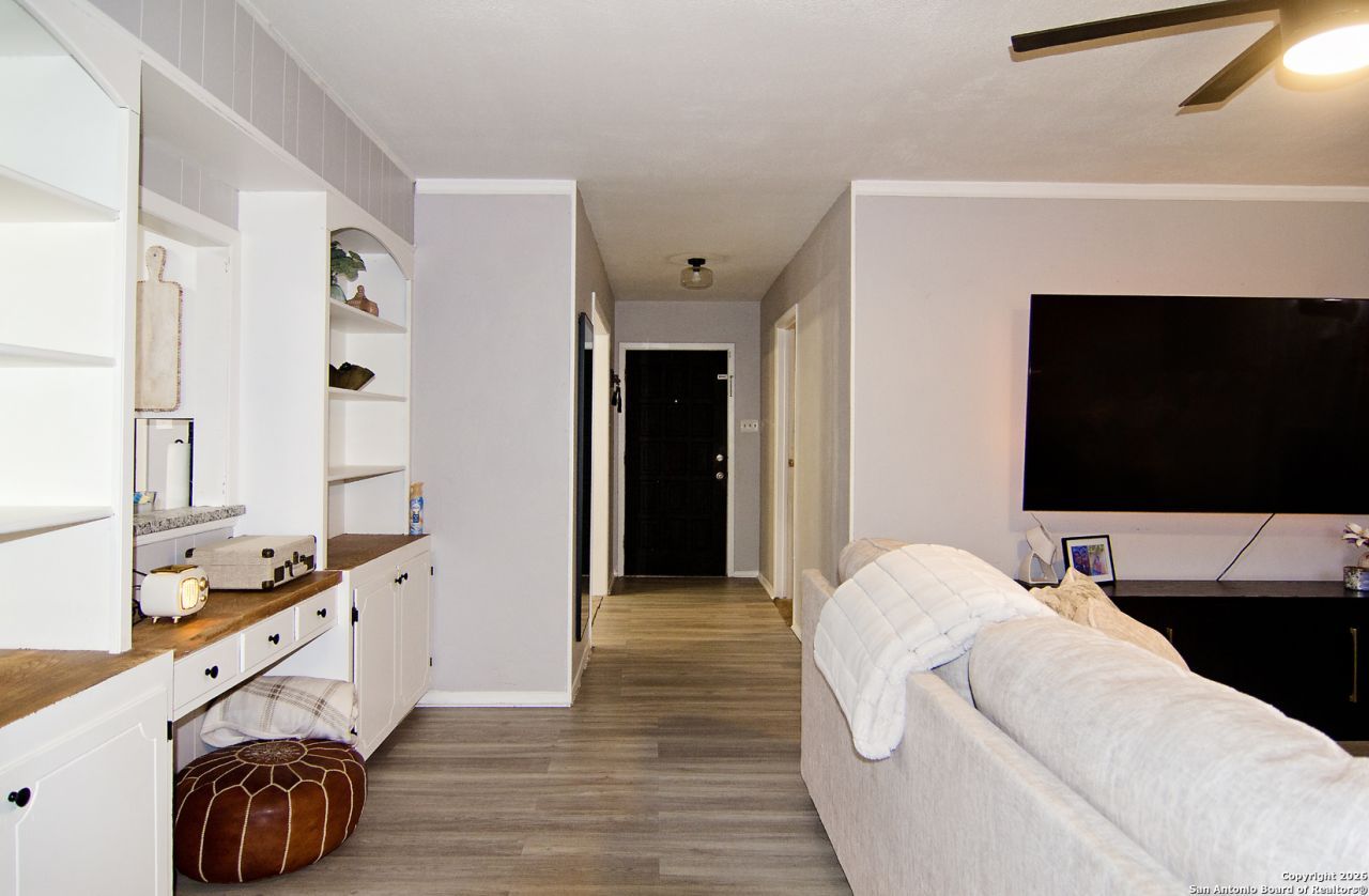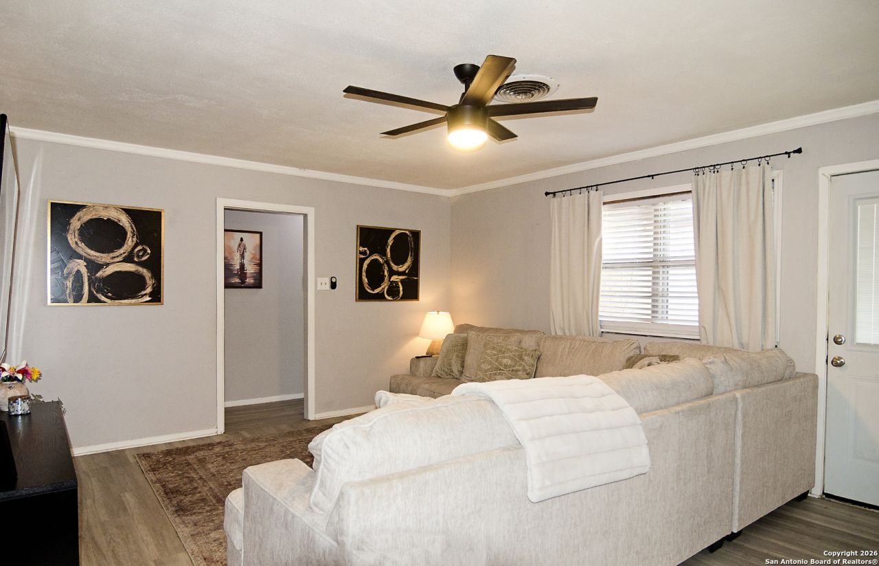 Welcome to refined comfort in the heart of Estrada Heights. Nestled on a quiet, tree-lined street in this established subdivision, this beautifully updated 4-bedroom, 2-bath home offers 1,787 square feet of inviting, move-in-ready living space. Step inside to a warm and open layout where a spacious living area serves as the heart of the home-perfect for everyday living and entertaining alike with durable laminate wood flooring. The kitchen is both stylish and functional, featuring gas cooking with a separate cooktop and oven, generous counter space, and an easy flow to the dining and living areas-ideal for the everyday chef. Just off the kitchen, youll find a convenient laundry/mudroom with direct access to the garage. The primary suite is filled with natural light, offering ample space plus a versatile nook perfect for a vanity, desk, or reading corner. The en suite bathroom has a walk in shower with pebble floor. The main bathroom features ceramic tile, a large vanity, and a pocket door separating the vanity from the shower and commode area for added functionality. Outdoors, enjoy a fully fenced backyard shaded by mature trees-perfect for entertaining, relaxing, or pets. Opportunities to own a 4-bedroom home like this are rare, making this property an exceptional find. With gas cooking, updated finishes, generous living space, and a spacious backyard, this home checks all the boxes. Schedule your private showing today-this one wont last. Wood playground equipment does not convey.