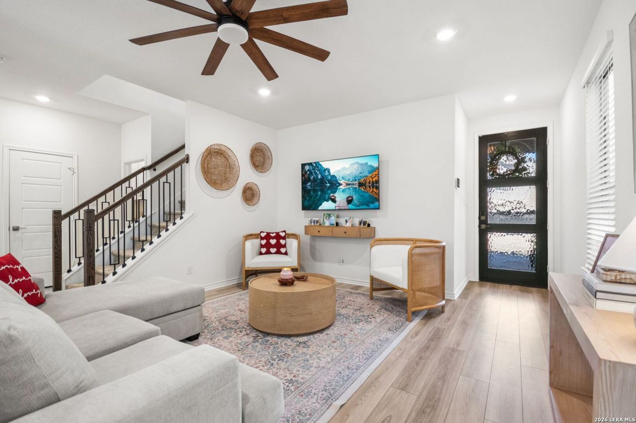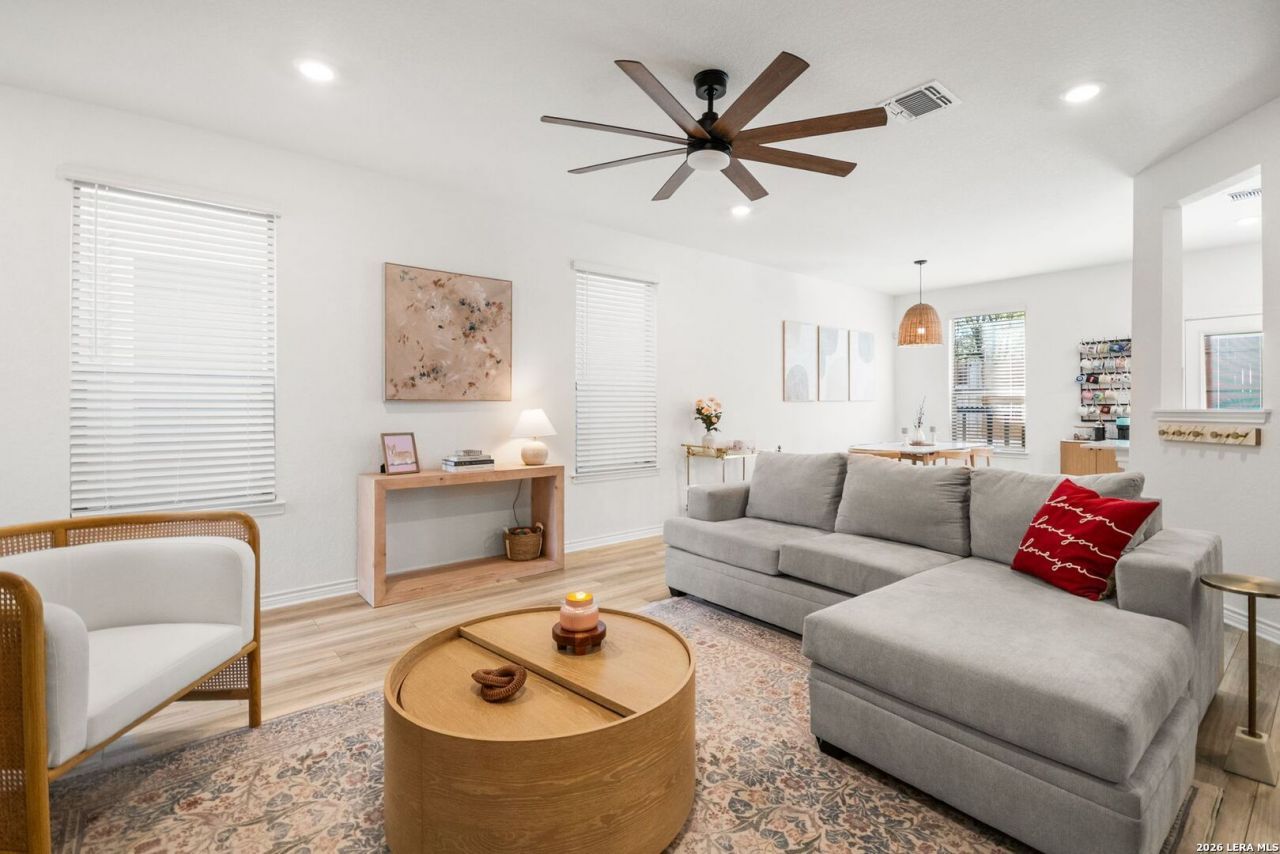Located in the desirable Villas at Presidio, this beautifully upgraded home offers a refined blend of comfort, style, and functionality. Thoughtfully enhanced with over $30,000 in builder upgrades, the residence showcases elegant finishes and quality details throughout. Interior features include luxury vinyl plank flooring throughout the main living areas, ceramic tile in the laundry room, and carpet in all bedrooms and the loft. Architectural details such as wrought-iron stair and loft railings, 2-inch faux wood blinds, ceiling fans, and a striking custom front door add warmth and sophistication. The upgraded kitchen is appointed with Silestone countertops and enhanced cabinetry, with additional cabinetry extending into the laundry room for added storage and convenience. The primary suite offers a double vanity, 42-inch shower, walk-in closet, large linen closet, and a private water closet. The secondary bath features an extended vanity with knee space, providing added functionality and comfort. Everyday practicality is elevated with an overhead garage storage rack system, plumbing for a soft water system, and a full gutter system. Outdoor living is equally inviting with an extended rear patio, ideal for relaxing or entertaining. Smart-home readiness is seamless with CAT-6 wiring throughout and pre-wiring for indoor and outdoor cameras, offering modern connectivity and peace of mind. Ideally situated with quick access to La Cantera, The Rim, Six Flags, the Medical Center, Downtown San Antonio, and Boerne, this home delivers an exceptional combination of location, upgrades, and lifestyle.