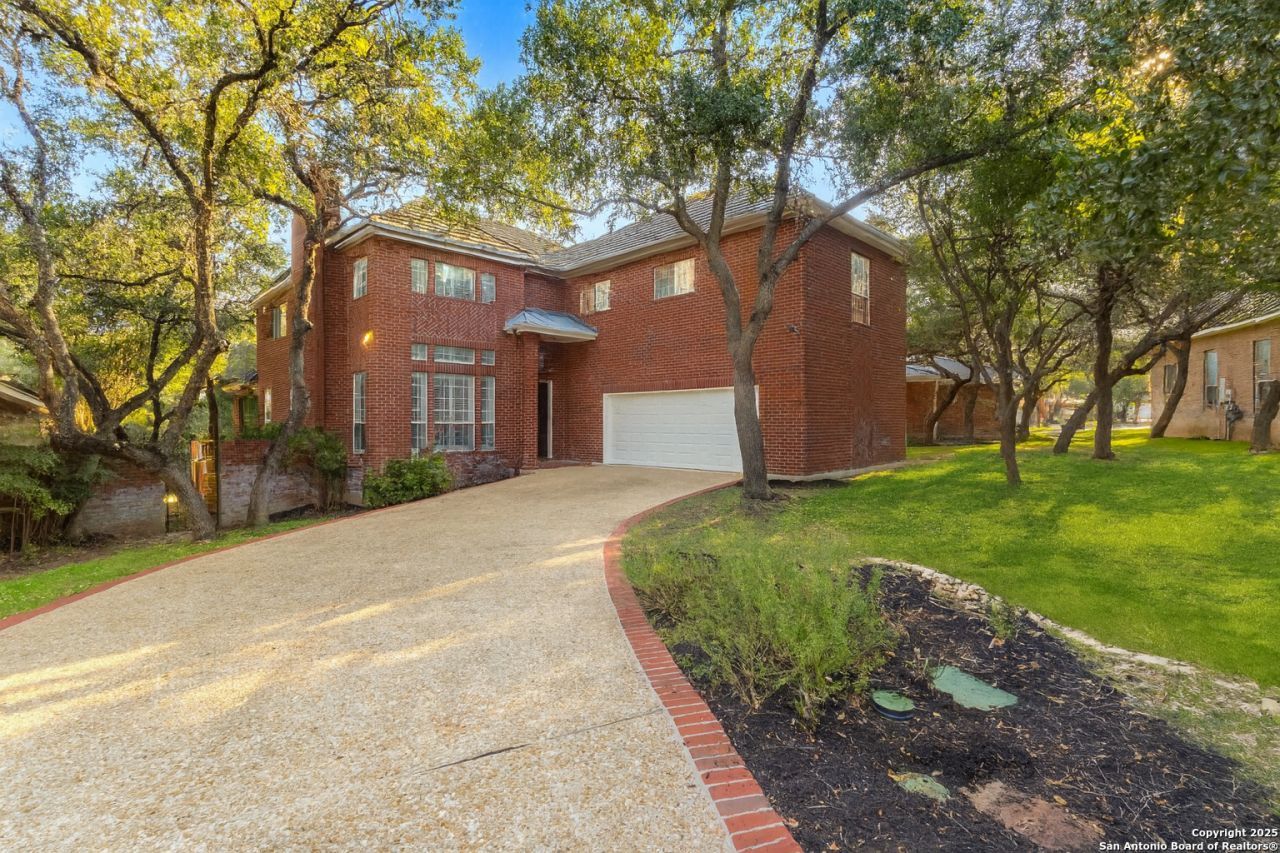 Located in the Garden Home section of Elm Creek, this two-story traditional offers space, privacy, and peace of mind in a secure, 24-hour guard-gated community. Featuring 4 bedrooms, 3.5 baths, 2 living areas, 2 dining areas, a loft with built-in desk, and a separate flex room with walk-in attic access and abundant storage. Primary suite downstairs with sitting area, patio access, and dual walk-in closets. Updates include new HVAC, new interior and exterior paint, new carpet, and a new side-entry garage door and opener. Hardwood floors, plantation shutters, high ceilings, and a gas fireplace add warmth and function. The kitchen offers an island, bar seating, and new stainless-steel appliances (refrigerator conveys). Covered patio and extended deck overlook a private greenbelt with no neighbors behind. Low-maintenance cul-de-sac lot ideal for lock-and-leave living. Quick access to major highways, the Medical Center, USAA, UTSA, Valero, La Cantera, The Rim, and San Antonio International Airport.