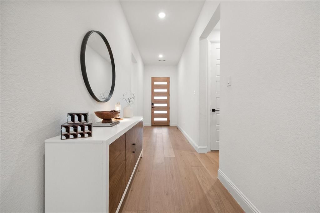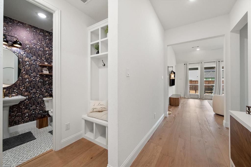 Presenting a fully loaded masterpiece tucked within the highly sought-after M3 Ranch community of Mansfield, this breathtaking 4-bedroom, 2.5-bath home spans 2,269 Sq. Ft.Step inside to soaring vaulted ceilings and expansive picture windows create a dramatic first impression, flooding the home with natural light and highlighting rich wide-plank hardwood flooring through the main living areas, hallways, and primary suite. A whole-home upgraded 4K LED lighting system delivers a crisp, modern glow throughout.The chef’s kitchen is a true showpiece. Anchored by an oversized island, it features a commercial-grade cooktop and vent hood, full KitchenAid appliances, upgraded white-veined quartz countertops, and a designer white tile backsplash. Striking gold fixtures add a sophisticated designer touch.The breakfast area is stunning, highlighted by a dramatic wall of windows that bathes the space in sunlight.Secondary bedrooms offer plush designer carpet and modern ceiling fans, while the fourth bedroom can serve as an office, featuring designer wallpaper. Even the powder bath exudes personality with custom paint, upgraded fixtures, and bold detailing.The primary suite is complete with a bay window creating a perfect sitting area framed by natural light. Hardwood flooring continues the elevated aesthetic, while the ensuite bath and expansive walk-in closet crowned with a chandelier showcase luxury in the details.Step out to a large covered back patio with built-in lighting and a ceiling fan. The garage is fully textured and painted, includes upgraded 4K LED lighting, and features a 220V exterior outlet for generator hookup. With a two-car garage, dramatic architectural lines, and designer finishes throughout, this home is loaded with upgrades and crafted to impress. Added peace of mind comes with the builder-backed structural and foundation warranty through 2028. Buyers who choose the preferred lender may receive $5,000 toward closing costs.