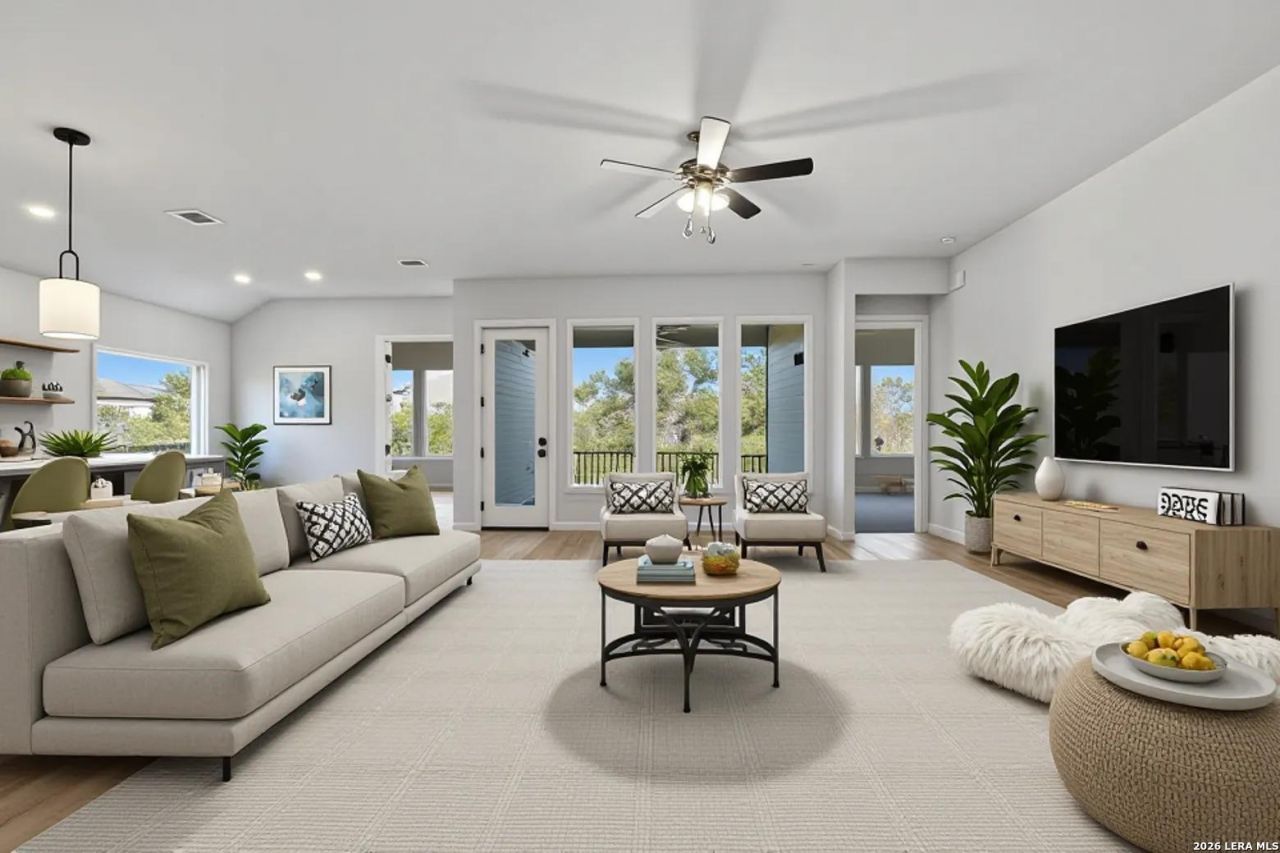 ** Ready Now! ** Low Rate Available ** Welcome to 1590 Lone Grapevine, a stunning home located in the charming Meyer Ranch community of New Braunfels, TX. This beautifully designed residence boasts 4 spacious bedrooms and 3 bathrooms, along with versatile spaces including a flex room and a dedicated office, perfect for work or leisure. The open-concept living room seamlessly flows into the modern kitchen, making it ideal for family gatherings and entertaining guests. The kitchen is a chefs dream, featuring light white cabinets, a sleek tile backsplash, quartz countertops, and decorative pendant lights that elegantly illuminate the large kitchen island. Enjoy the convenience of built-in appliances, making meal prep a breeze. Step outside to discover spacious covered patios at both the front and back of the home, perfect for enjoying your morning coffee or hosting outdoor gatherings with family and friends. Meyer Ranch offers an exceptional lifestyle with access to beautiful natural landscapes, scenic walking trails, and community amenities designed for relaxation and recreation. Residents can enjoy a resort-style pool, playgrounds, and picnic areas, fostering a close-knit community atmosphere.