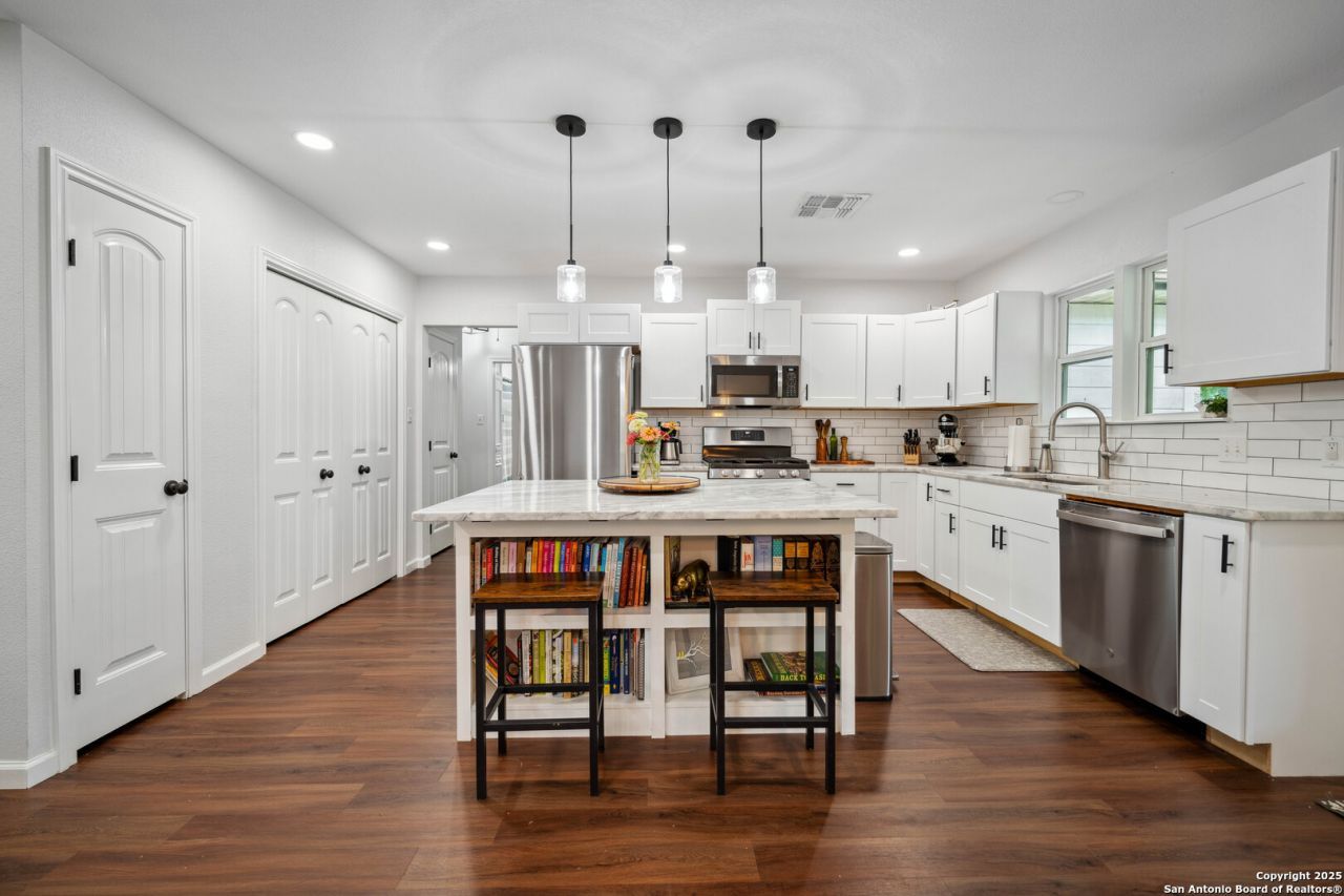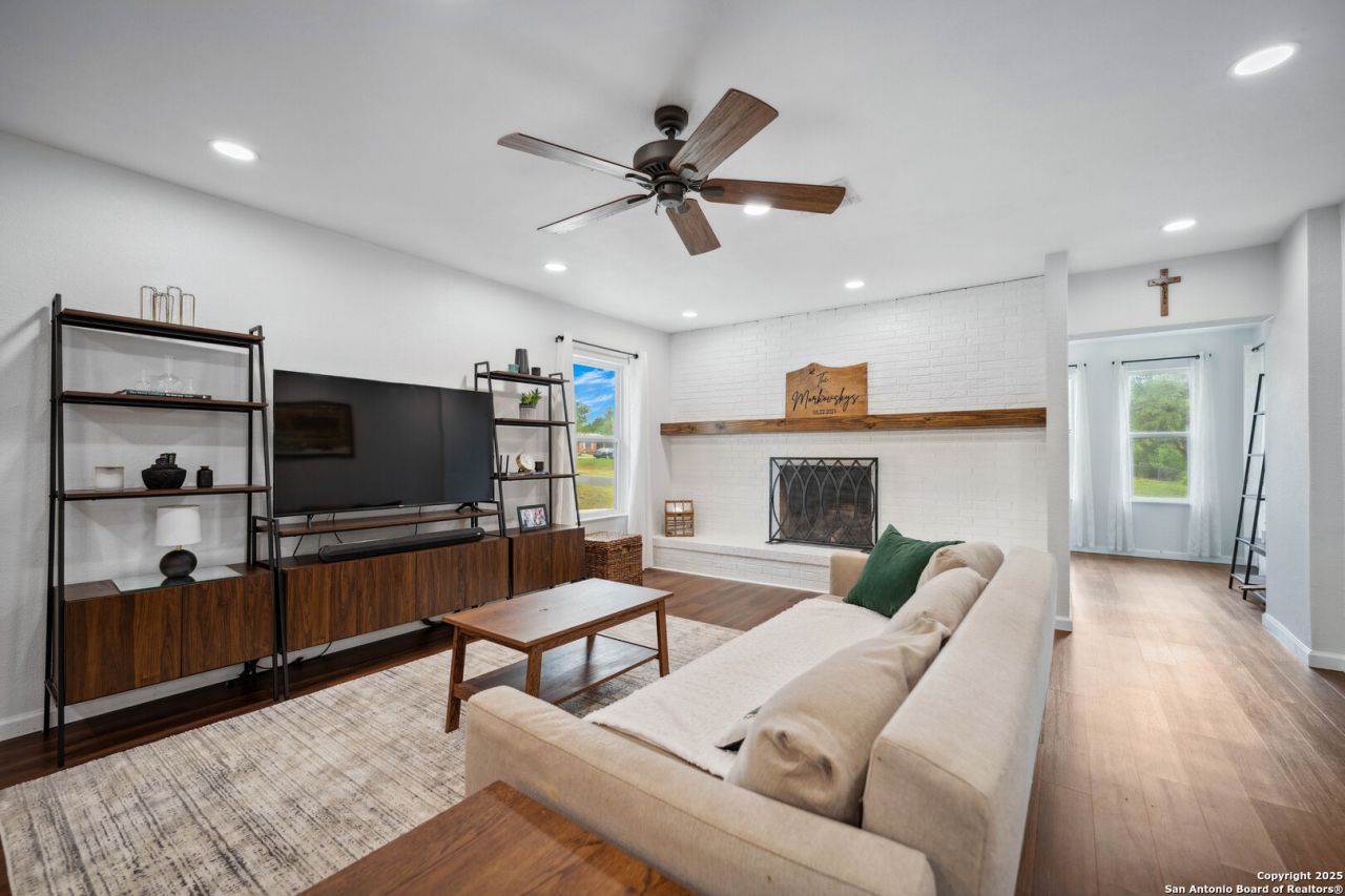 Welcome to this beautifully remodeled home on a half acre conveniently located in the heart of Floresville. This 3-bedroom, 2-bathroom home blends modern elegance with everyday functionality. Step inside to an open-concept living space featuring a sleek, contemporary interior with fresh finishes throughout. The kitchen is the heart of the home, boasting a stylish island with a breakfast bar, granite countertops, custom cabinetry, and stainless steel appliances-perfect for entertaining or casual meals. The spacious primary suite includes a private bath, while two additional bedrooms offer comfort and versatility. A large utility room/secondary kitchen with mini-split features a commercial stainless steel sink and gas stove, perfect for home canning or baking. Outside, enjoy the expansive covered patio-ideal for relaxing or hosting guests-overlooking a well-maintained, productive garden with raised beds, mature plantings, and a practical garden shed. This turnkey property is perfect for those who appreciate modern living with a touch of self-sufficiency.