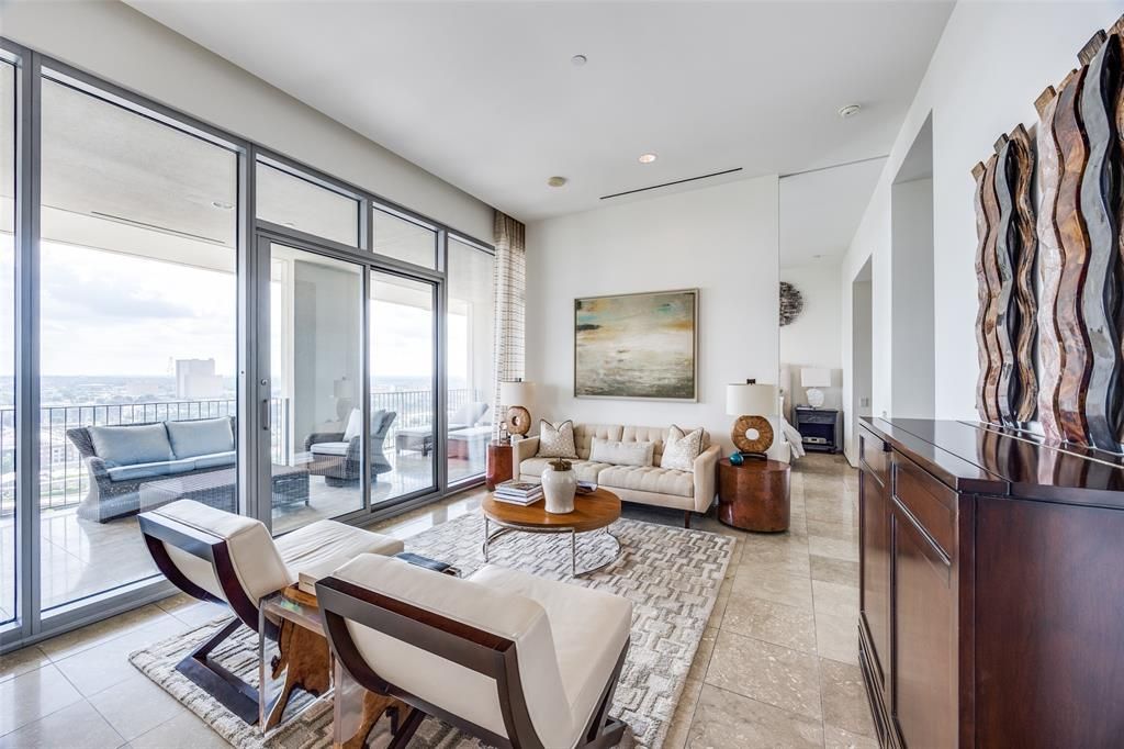Experience the best in luxury high rise living in the Lionel Morrison designed One Arts Plaza building! Located in the heart of the Arts District, this one bedroom, one and a half bath residence is within walking distance to the Dallas Museum of Art, Meyerson Symphony Center, Moody Performance Hall, and Winspear Opera House. Elegance abounds in this sleek and modern unit with eleven foot ceilings, floor to ceiling windows, and a 50 X 10 foot covered terrace overlooking East Dallas. Natural light flows through the living room and dining area creating an ideal entertaining space, or also a quiet space to just relax. Open Balthaup kitchen offers island, eat in kitchen, Miele appliances, subzero wine cooler plus an integrated refrigerator and freezer.The primary bedroom includes a sliding glass door to the terrace, a spa worthy bathroom with separate tub and shower, and custom closet space. A versatile office space is located off the primary bedroom. In addition to this fabulous downtown Dallas location within close proximity to fine dining and shopping, One Arts amenities include a pool, fitness center, doorman, valet, 24 hour security and concierge, event room, electric car chargers, and two assigned parking spaces.