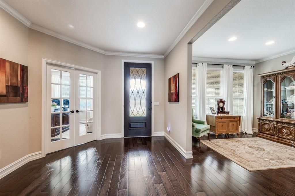 Welcome to exceptional lakefront living in the highly sought-after 55+ community of Frisco Lakes by Del Webb. This beautifully maintained 2018 single-story home offers 2,595 sq ft of thoughtfully designed living space on a premium waterfront lot with breathtaking backyard views.Step inside to an open-concept floorplan featuring rich engineered wood flooring, granite countertops, decorative lighting, and abundant natural light. The spacious living area flows seamlessly into a chef’s kitchen complete with a large island, built-in gas appliances, double ovens, walk-in pantry, and generous cabinet space, perfect for entertaining or everyday comfort.Designed with flexibility in mind, this home features two bedrooms, 2.5 baths, that includes a versatile second primary-in-law suite layout ideal for guests. The oversized primary suite includes dual sinks, separate shower, and large walk-in closet. The utility room includes an added water line for a second refrigerator—an excellent bonus for additional storage and entertaining needs.The true showstopper is the extended covered patio overlooking the tranquil lake. Enjoy peaceful mornings and evenings with unobstructed water views behind wrought iron fencing—your own private retreat.Located in an amenity-rich golf community offering clubhouse, fitness center, pools, pickleball, tennis, walking trails, and more.This is the waterfront lifestyle opportunity buyers wait for.
