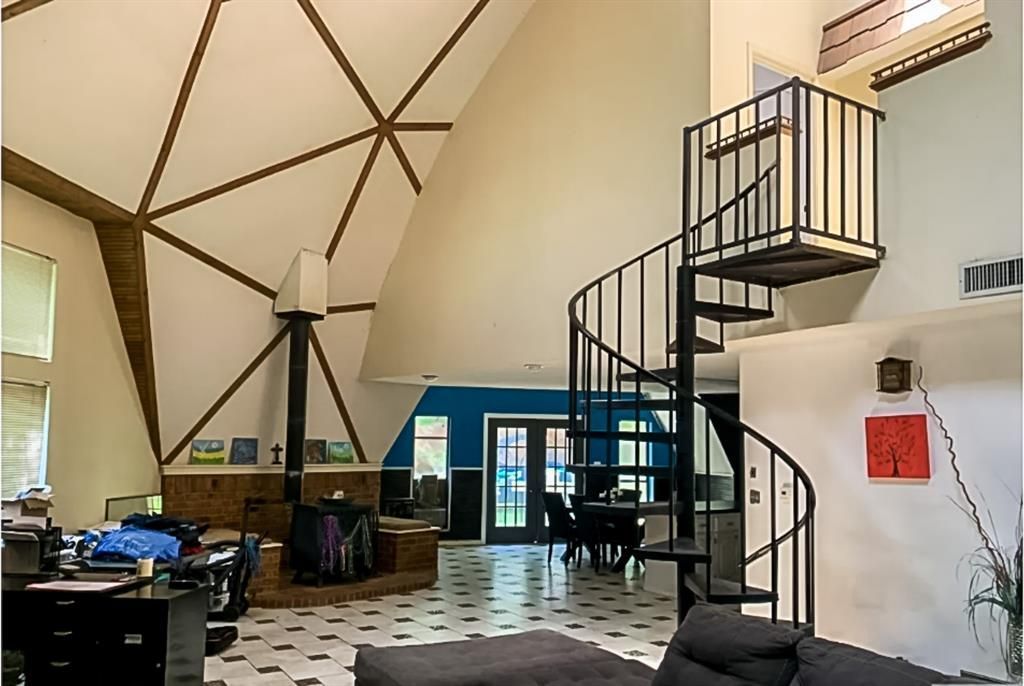 Unique two-story dome home set on approximately .375 acres offering a striking open-concept design and distinctive architectural character. The home features roughly 2,400 square feet with 3 bedrooms and 2 bathrooms, a spacious kitchen with island and pantry, and a dramatic spiral staircase. A wood-burning stove anchors the main living area, while geometric skylights flood the space with natural light. The primary bedroom is located on the main level, with two additional bedrooms upstairs connected by a landing that overlooks the living and kitchen areas below. Large laundry room, generous closet space, artistic details throughout, and a recently installed roof add both function and appeal. A rare and eye-catching property that offers something truly different.