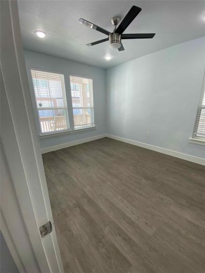 This stunning three-story home in downtown Lewisville offers the ultimate in convenience and modern living, with shops and restaurants just a short stroll away. The thoughtfully designed floor plan boasts contemporary layouts and high-end finishes throughout. Upon entry, you're greeted by a versatile laminated floor bedroom, perfect for a home office, complete with an ensuite bathroom. The second floor is dedicated to an expansive open-concept living space, featuring beautiful wood laminate flooring. The gourmet kitchen is a chef's delight, equipped with top-of-the-line stainless steel electric appliances, sleek all-white cabinetry, gleaming granite countertops, a large single-bowl kitchen sink, and a spacious kitchen island ideal for entertaining. Recessed lighting illuminates this inviting space. The third floor houses the private sleeping quarters, including the luxurious primary bedroom and a third bedroom, each boasting its own ensuite bathroom for ultimate comfort and privacy. All stairs and bedrooms are adorned with high-quality carpeting, adding a touch of warmth and sophistication. Short distance to DCTA train station for traveling north to Denton and south to Carrollton connecting to DART Green Line and DART Silver Line to DFW airport.