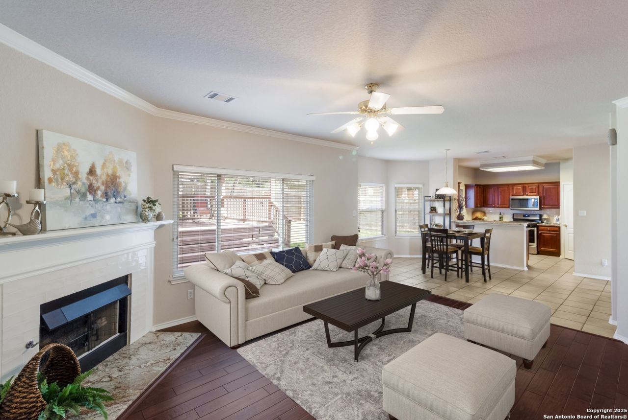 Looking for just the right location? Check out this beauty in the gated community of the Village of Encino Park. Located on oversized .248 lot, this stunning two-story home offers both space, comfort and style. Inside discover 2500 square feet of beautifully designed living space. The open and spacious floor plan flows effortlessly from room to room. The main level features hardwood floors and tile. The living room - dining room combo is the perfect gathering space for family and friends. An attractive kitchen offering gas cooking, modern tile backsplash, and solid countertops, stand in pantry and extra closet space for additional storage. Counter space offers more than enough prep areas. The beauty of natural light enhances the home through the modern and picturesque windows, views of the backyard from the kitchen windows make it easy to keep an eye on kids if needed. Additional features include artist niches, attractive flooring and high ceilings! Gather with family and friends in the second living area which is perfect for game night, movie night and on those cooler evenings be sure to snuggle up with to warmth of the gas burning fireplace. There is no shortage of living space here. Upstairs the primary master suite is more than spacious and has plenty of room to include a relaxing sitting area. Escape to the luxurious bath with separate shower, oversized garden tub, dual vanities, and a colossal walk-in closet. 3 additional generously sized bedrooms, all with walk-in closets. Take in the great outdoors. Whether its hosting BBQ gatherings or chilling out in the gazebo; youll enjoy your time unwinding under the Texas stars. The private lush, park-like backyard is a true sanctuary. Mature shade trees, and plenty of room for outdoor fun. Additional features: ample storage and walk-in closets, Energy-efficient windows and HVAC system, located in desirable community, residents enjoy access to top-rated schools; walk to NEISD Elementary and Middle schools under 10 minutes. Quick and easy access to Highway 281, Loop 1604, shopping, medical and dining. Dont miss this rare opportunity to own a beautiful home with room to grow in one of San Antonios most beloved neighborhoods.