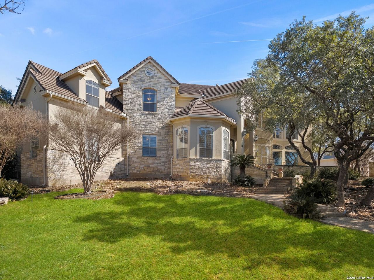 Phenomenal location! Experience hilltop living with majestic views in the desirable gated Village in the Hills neighborhood. This custom two-story home offers space for all with 5 bedrooms and 4.5 bathrooms and true resort style grounds. High ceilings and expansive windows frame the home with natural light, creating a sense of openness and scale throughout. The kitchen suits cooking and entertaining alike, boasting an expansive L shaped center island, stainless steel appliances, extensive cabinetry, walk in pantry, all while overlooking the main living area, creating a seamless central gathering area. The primary suite provides a private retreat with architectural ceiling details, direct access to the outdoors, two walk-in closets, and a generously sized bath with soaking tub and separate shower. Secondary bedrooms are well appointed with en-suite bathrooms and walk-in closets. Additional spaces include a office, formal living room, and a game room with custom built-ins. Outdoors, the lushly landscaped grounds are designed for both relaxation and entertaining. The resort-style pool features multiple water elements, a grotto, and sun shelf, surrounded by mature landscaping creating utmost privacy. Multiple outdoor living areas include a covered kitchen with grill, sink, and prep space, complemented by additional pergola seating. Oversized two car garage offers ample storage opportunities and built-in racks. Located minutes from Stone Oak Park, shopping, restaurants, medical, San Antonio Airport, and Downtown San Antonio.