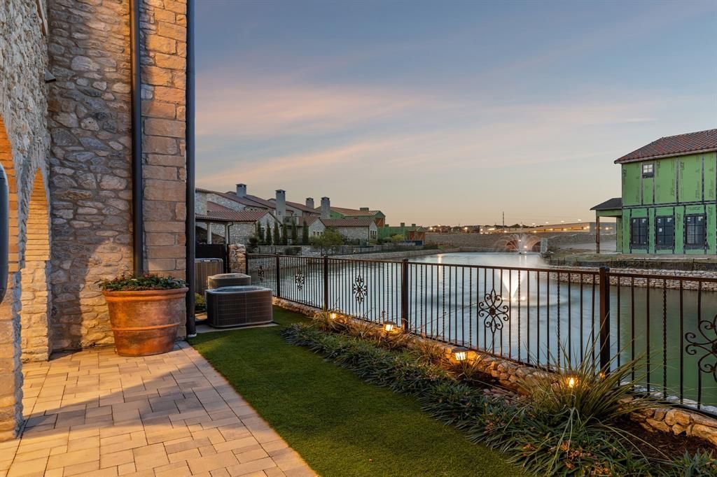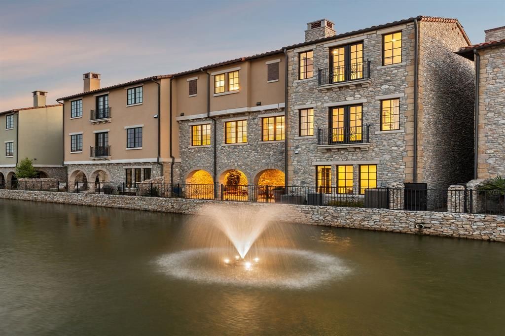 Welcome to 22 Comillas Dr, a meticulously cared-for waterfront townhouse with beautiful designer upgrades! Perfectly positioned along the canal in the heart of Westlake Entrada, a lock-and-leave community tailored for those who value refined living and everyday ease. Enjoy serene views of the canal, fountains, and stone bridge from multiple rooms of this home, along with curated finishes such as designer wallpaper, dimmable lighting, in ceiling speakers, and both under and over cabinet lighting. The light-filled kitchen offers canal views through the multiple windows and is well-appointed with Sub-Zero and Wolf appliances and custom cabinetry. A timeless cast stone fireplace, motorized custom made curtains, and a Juliet balcony overlooking the canal enhance the welcoming family room. The primary suite is a true sanctuary, featuring its own Juliet balcony with canal views, a built-in coffee bar, and a spa-like bath with dual vanities, a soaking tub, walk-in shower, expansive walk-in closet, and a private elevator for added ease and privacy. The floor plan offers two additional en-suite bedrooms, a spacious laundry room, and a private front-facing office—perfect for quiet focus and complete with motorized shades. Downstairs, the stylish game room invites relaxation and connection, featuring a custom wet bar with Sub-Zero beverage cooler, Roman shades, a half bath, and French doors that open to a tranquil patio. With both covered and open-air spaces, a calming water feature, and peaceful canal views, the outdoor retreat is ideal for effortless entertaining. Additional highlights include: Focal in-ceiling speakers, built-in dressers, one upgraded larger AC unit installed in 2023, and a fire-protected safe in the office closet. Patio furniture and TV in family room convey with the home. Choose Carroll ISD or Westlake Academy (an IB World School). Conveniently located just minutes from DFW Airport, LifeTime Fitness, and Southlake Town Square.