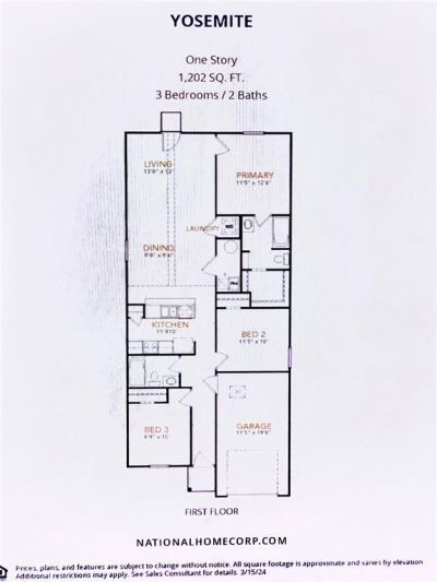 MLS# 20914748 - Built by NHC - Ready Now! ~ The Yosemite Plan from our Freedom Series is a cozy and efficient single-story home featuring 3 bedrooms, 2 bathrooms, a 1-car garage, and 1,202 square feet of smartly designed living space. This split-level floorplan places two secondary bedrooms and a full bathroom at the front of the home, offering privacy and convenience. Continue into the open-concept living area, where the kitchen with a central island overlooks the dining area and family room— perfect for meals, gatherings, and quality time. The primary suite is thoughtfully positioned off the family room for added privacy and includes a private bathroom and walk-in closet. The laundry room is also conveniently located on this side of the home for easy access. Known for providing the lowest price and price per square foot, National Homecorp is here to help you get more home for your money! The Yosemite Plan is the smart choice for your next home. Start your journey to homeownership today! Disclaimer: Photos may not represent the actual home. They are for illustrative purposes only and may depict a similar home with the same floorplan.