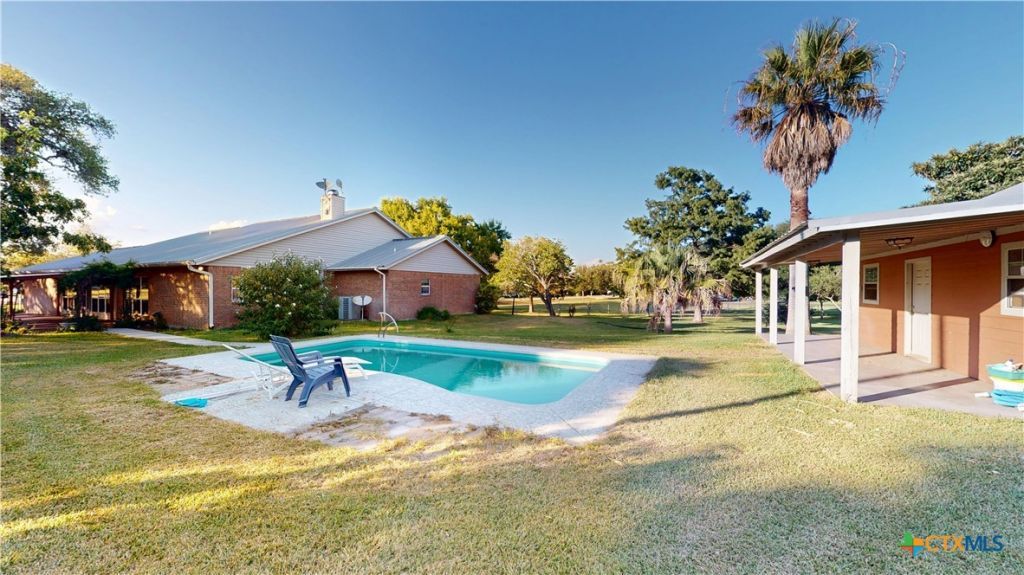 Drastically reduced! Sprawling Country Retreat Near Coletto Creek Reservoir. Nestled on approximately 1.3 acres, this spacious 4-bedroom, 2.5-bathroom home offers the perfect blend of peaceful country living and modern comfort. Surrounded by oaks, cypress, and pecan trees, the property provides a serene, shaded setting ideal for relaxing or entertaining. Step inside to find an inviting open-concept layout featuring a cozy fireplace, built-in china cabinet, and custom bookshelves. The heart of the home is the open kitchen, complete with granite countertops, a center island, breakfast bar, and a generous walk-in pantry?perfect for any home chef. Enjoy the natural light in the large sunroom overlooking the backyard oasis. The private master suite includes two walk-in closets and built-in storage in both the bedroom and bath. The fourth bedroom, currently used as a home office, features built-in bookcases and flexible space for work or guests. Outdoors, enjoy a covered patio, sparkling pool, and a fully fenced yard with an irrigation system to maintain the lush landscaping. A detached 900 sq ft shop with its own bathroom provides endless possibilities?workshop, gym, or additional storage. Additional features include a two-car attached garage, newer AC and water heater, water softener, and plenty of storage throughout. This property is a rare find in a sought-after location near Coletto Creek Reservoir?offering space, comfort, and functionality in a peaceful country setting.