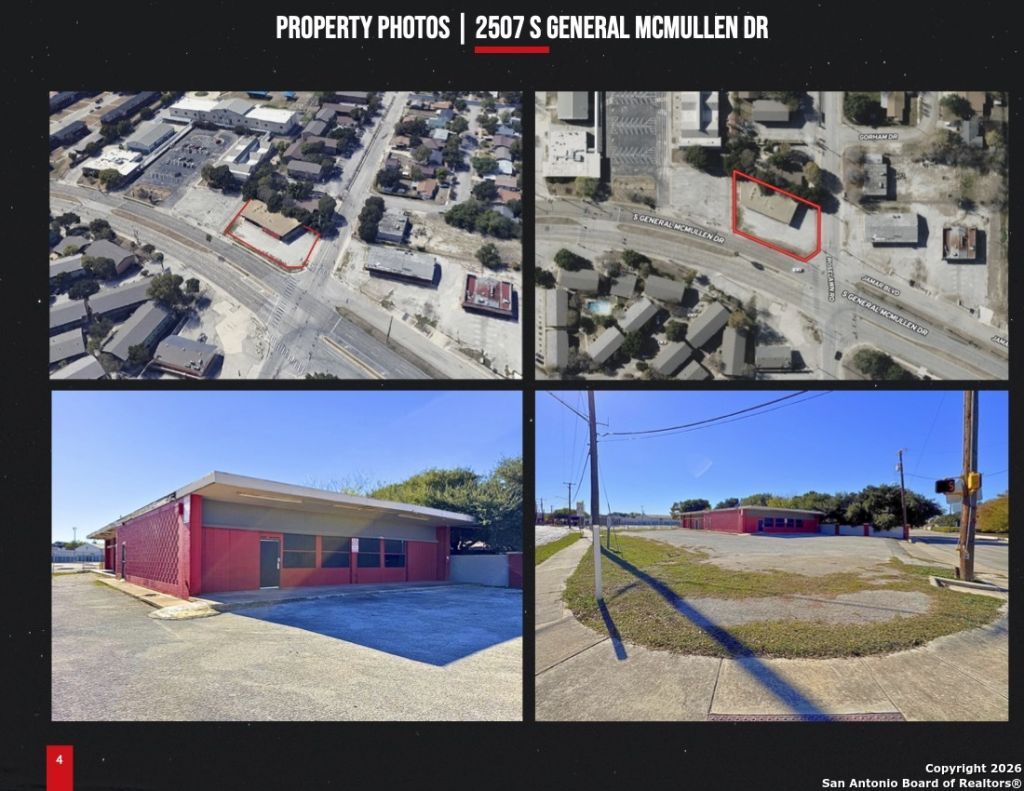 4,340 SF hard-corner retail property located on a 0.38 acre site in San Antonio. Zoned C-2, the property is well-suited for a wide range of retail, restaurant, or service-oriented uses and benefits from strong visibility, access, and traffic exposure. The site offers dual frontage totaling approximately 252 linear feet, including 170 feet along S. General McMullen Road and 82 feet along Roselawn Road, enhancing ingress, egress, and signage opportunities. Water, sewer, and electricity are available on site, supporting immediate redevelopment or occupancy. The building is currently divided into four separate suites, making it ideal for multi-tenant leasing or owner-investor strategies. Positioned just off S. General McMullen Drive and approximately 1.3 miles from US-90, the property sits at the gateway to Port San Antonio, a major employment and innovation hub anchored by 80+ organizations including Boeing, GXO Logistics, StandardAero, Toyota Tsusho America, Inc., Plus One Robotics, Knight Aerospace, and Booz Allen Hamilton. Nearby anchors also include the Kelly Field Historic District, Edgewood Veterans Stadium, and Kennedy High School, located directly across the street. Additionally, three adjacent properties are also available, offering a rare opportunity to acquire a contiguous cluster of commercial assets. These include 2415 Jamar Street (3,222 SF former restaurant on 0.67 acres), 2423 Jamar Street (5,090 SF retail building on a 0.33 acre hard-corner lot), and 3311 Roselawn Road (2,460 SF O-2 zoned office building on 0.64 acres with fenced parking). Together, these properties present an exceptional opportunity for assemblage, phased redevelopment, or campus-style occupancy within a high-visibility growth corridor.