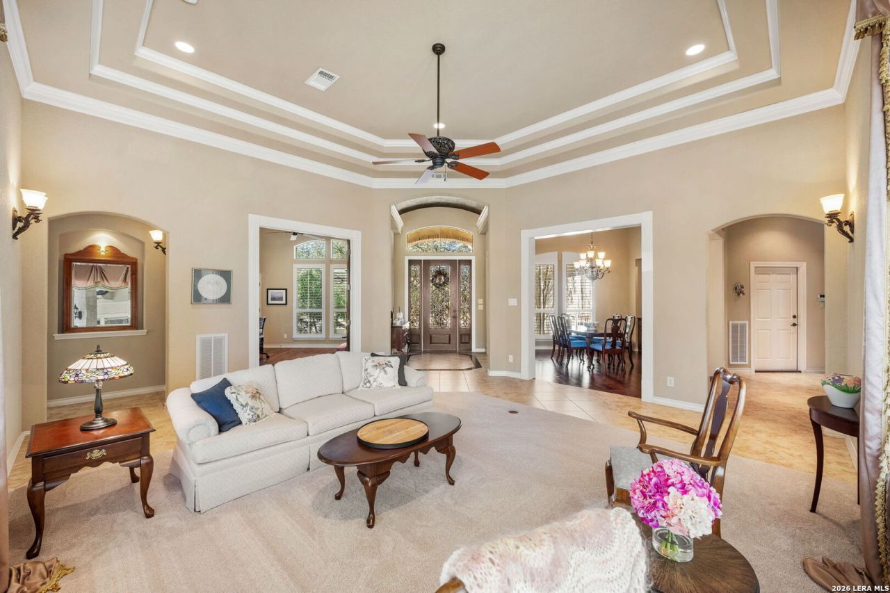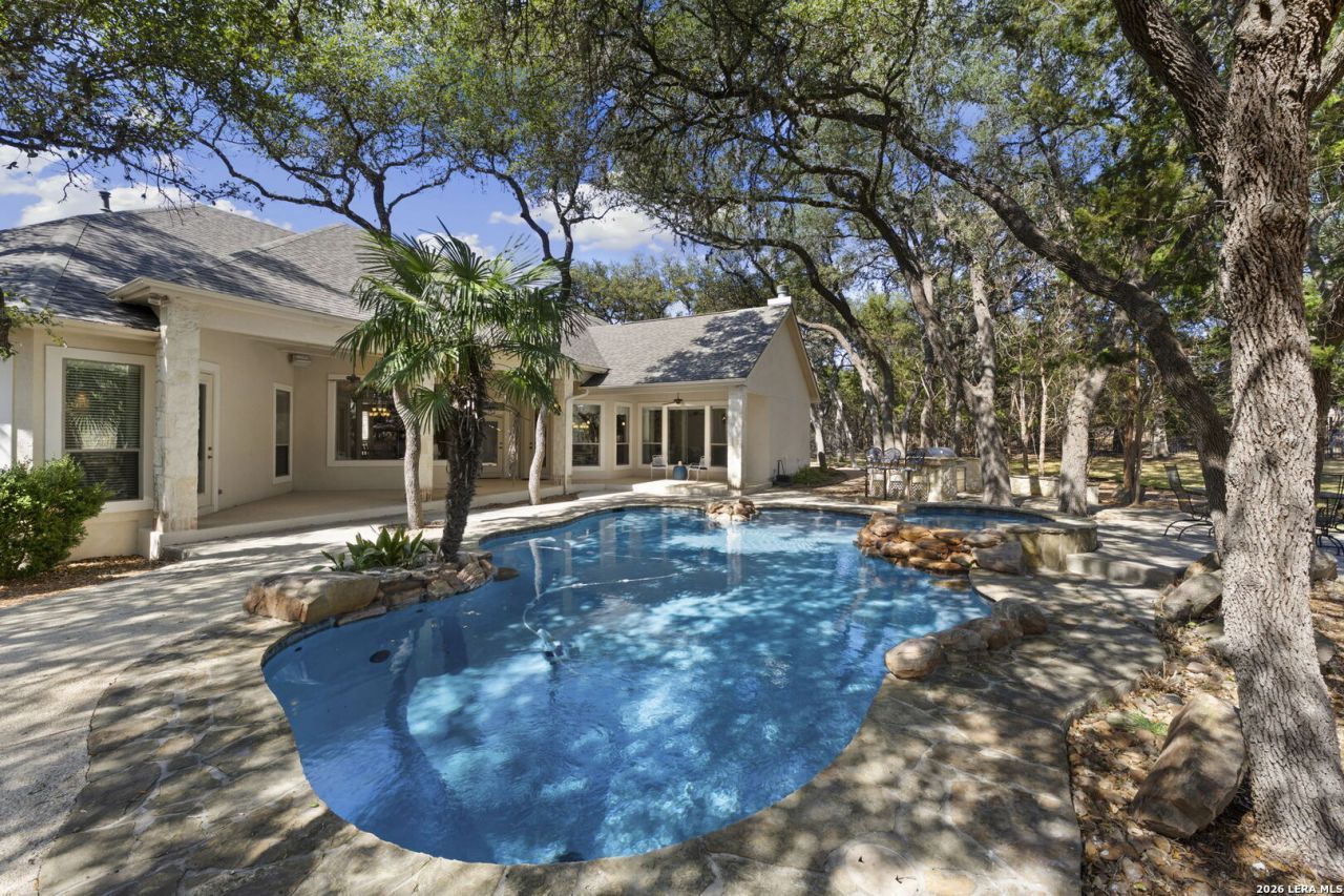 Theres something enduring about a thoughtfully designed one-story - where the proportions feel balanced, transitions unfold naturally, and the layout simply makes sense from the moment you walk in. At 27662 Oak Brook Way, 3,711 square feet stretch gracefully across a single level, creating a floor plan that lives with both ease and intention. Through the leaded glass front door, the formal living room welcomes you with expansive windows that wrap the corner of the space. A striking frameless glass corner detail draws in natural light from two sides, and as you move through the room, the view of the pool slowly comes into focus - a subtle architectural moment that beautifully connects indoors and out. The updated kitchen blends timeless design with everyday function, featuring quartz countertops, a gas cooktop, generous cabinetry, and a neutral-toned backsplash highlighted by a niche detail with its own distinctive pattern - a quiet touch of character. It opens effortlessly to the main living and dining areas, making the home as comfortable for daily life as it is for entertaining. With two living spaces, two dining areas, and a private study, the layout offers flexibility without sacrificing flow. The primary suite provides a peaceful retreat, while the bath has been thoughtfully refreshed with updated countertops and undermount sinks that enhance both function and finish while honoring the homes classic style. Positioned on the opposite side of the home, the spacious secondary bedrooms offer privacy and comfort for family or guests. A conveniently placed half bath with direct access to the pool area adds ease for gatherings and outdoor living. Outside, the recently resurfaced pool accented with Lampasas stone, along with the spa, outdoor kitchen, and expansive covered porch, creates a setting designed for relaxed evenings and effortless entertaining. The beautifully treed half-acre lot offers both space and presence within the neighborhood. A three-car garage with polymer-coated floors completes this impeccably maintained Boerne home - a seamless blend of architectural detail, meaningful updates, and exceptional single-story living.