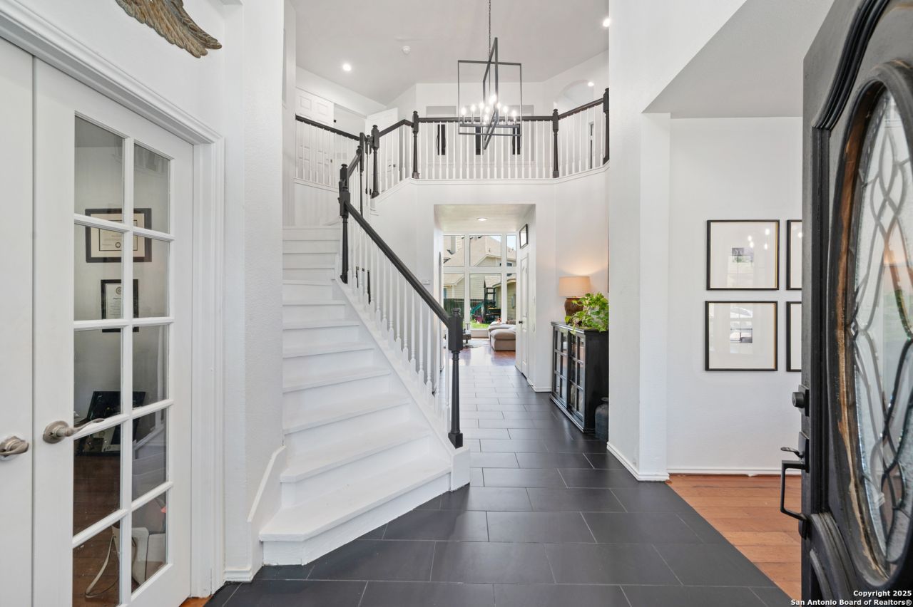 Masterfully renovated Perry Home in the well established, pristine neighborhood of Mill Creek Crossing. Located 15 minutes south of downtown New Braunfels in the highly sought-after Navarro ISD! Enter the home into the elegant foyer and youre greeted by 22 foot ceilings, a dramatic staircase and gangway, grand chandeliers and fresh paint throughout the entire home. Hand-scraped hardwood floors adorn the dining room with custom built-in cabinets from floor to ceiling and a generously sized office with French Doors. The kitchen features both an island and a breakfast bar, and overlooks the massive family room with 8 foot windows allowing natural sunlight to permeate every corner of the first floor. The ground floor Master Bedroom features a large bay window, separate his/hers vanity, shower, tub, and huge walk-in closet with premium built-in cabinets and storage. Upstairs youll find not 1 but 2 bonus rooms! Wow! Use one for a play room, one for a media room, or use one for entertaining and one as a secondary office. Its your house and its a free country! 3 additional bedrooms with high ceilings and generous walk-in closets complete the upstairs. Outside, take advantage of a large private backyard and a detached oversize 3 car garage and a fully gated & secure parking area. This home has it all!
