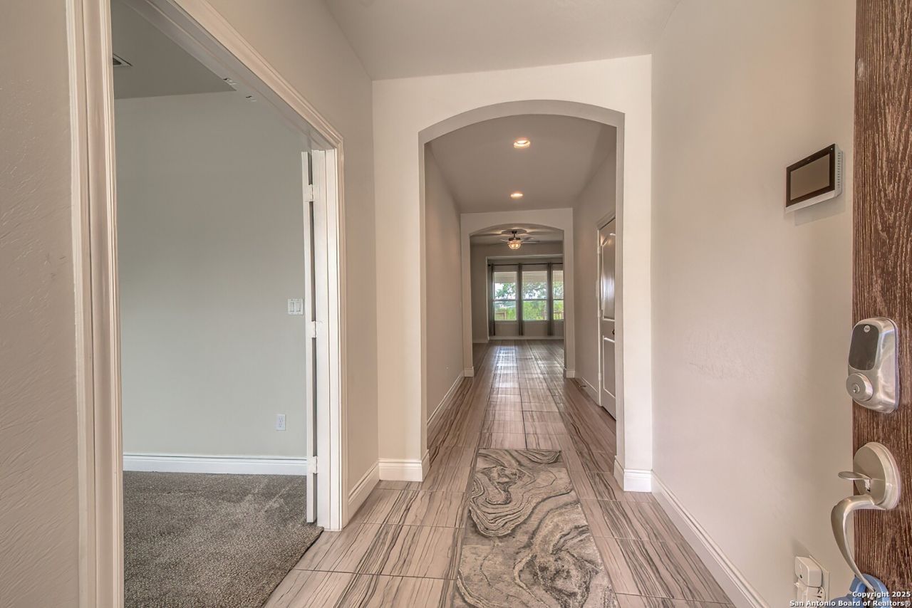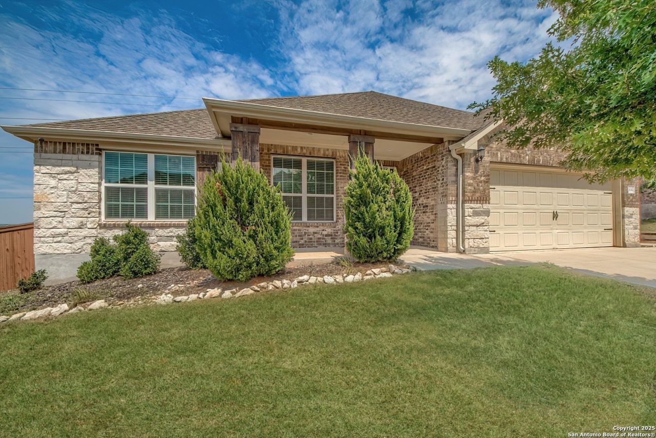 Welcome to this beautiful one-story home that perfectly blends comfort and convenience in the desirable gated community of Indian Springs. Featuring 3 bedrooms, 2.5 bathrooms, a private study, game room (optional 4th bedroom), and 2 car garage, this home is thoughtfully designed for todays lifestyle. Inside, a private study at the front of the home makes the ideal work from home space. The hallway opens into a spacious family room and open concept kitchen, creating the perfect setting for everyday living and entertaining. A versatile niche, open to the family room & kitchen, provides the perfect spot for a study nook or stylish bar. The primary suite, tucked away at the rear, features a beautiful en-suite with a large walk-in shower and closet. A game/flex room with a closet and bathroom separates the two secondary bedrooms and features a barn door, making it a great option for a fourth bedroom if needed. Step outside to enjoy a covered patio and large backyard deck with serene Hill Country style views, perfect for relaxing or entertaining. The community also offers fantastic amenities including a pool and park. All of this in a prime location just minutes from top rated schools, shopping, dining, and Hwy 281. Plus, take advantage of the 4.2 Assumable VA Loan, an incredible opportunity for qualified buyers!
