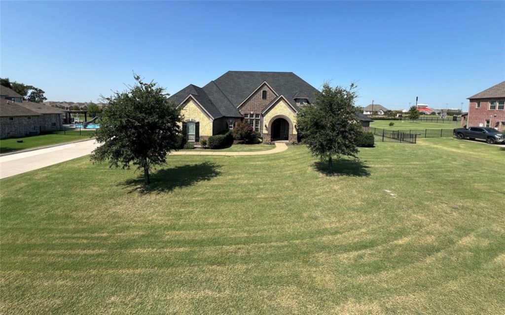 Stunning One-Acre Estate in Coveted Celina ISD. Welcome to your dream home in one of the most sought-after communities in the nation—Celina, Texas. Perfectly positioned less than one mile from Celina High School and within the highly acclaimed Celina Independent School District, this exceptional single-story estate offers the best of luxury, comfort, and convenience. Situated on a full one-acre lot with lush landscaping, mature trees, and expansive open space, this home combines elegance with functionality. Over 4,100 sq. ft. of single-story living space thoughtfully designed for both life and entertaining.4 spacious bedrooms, each with its own private en-suite bathroom and walk-in closet, plus an additional guest half-bath. Primary bath had a his-her closet. Expansive 4-car garage with soaring ceilings and deep bays designed to accommodate large trucks, SUVs, and recreational vehicles—with attic storage spanning the entire garage. A grand 100-foot driveway (25–30 feet wide). 2 inviting fireplaces anchoring the living spaces. Dedicated office, elegant formal dining, and open living and kitchen areas with soaring ceilings and natural light. Chef’s kitchen featuring ceiling-height cabinets, abundant counter space, a massive granite island, and dual dining options. Rich oak hardwood flooring throughout all main living areas and office, complemented by carpeted bedrooms and tiled bathrooms. Entertainment-ready spaces including a large bonus room with dual in-builts and a fully equipped media room with projector, surround sound, and nearly a 10-foot screen. 40-foot-wide covered back porch with dual access points, ideal for gatherings and relaxation. Private sport court (50’ x 35’), painted in Celina’s signature colors, featuring a regulation 72” MegaSlam glass basketball hoop with breakaway rim and pickleball lines. Two 40,000-lumen LED light towers for nighttime play, with bullhorn mounts ready for additional property lighting.