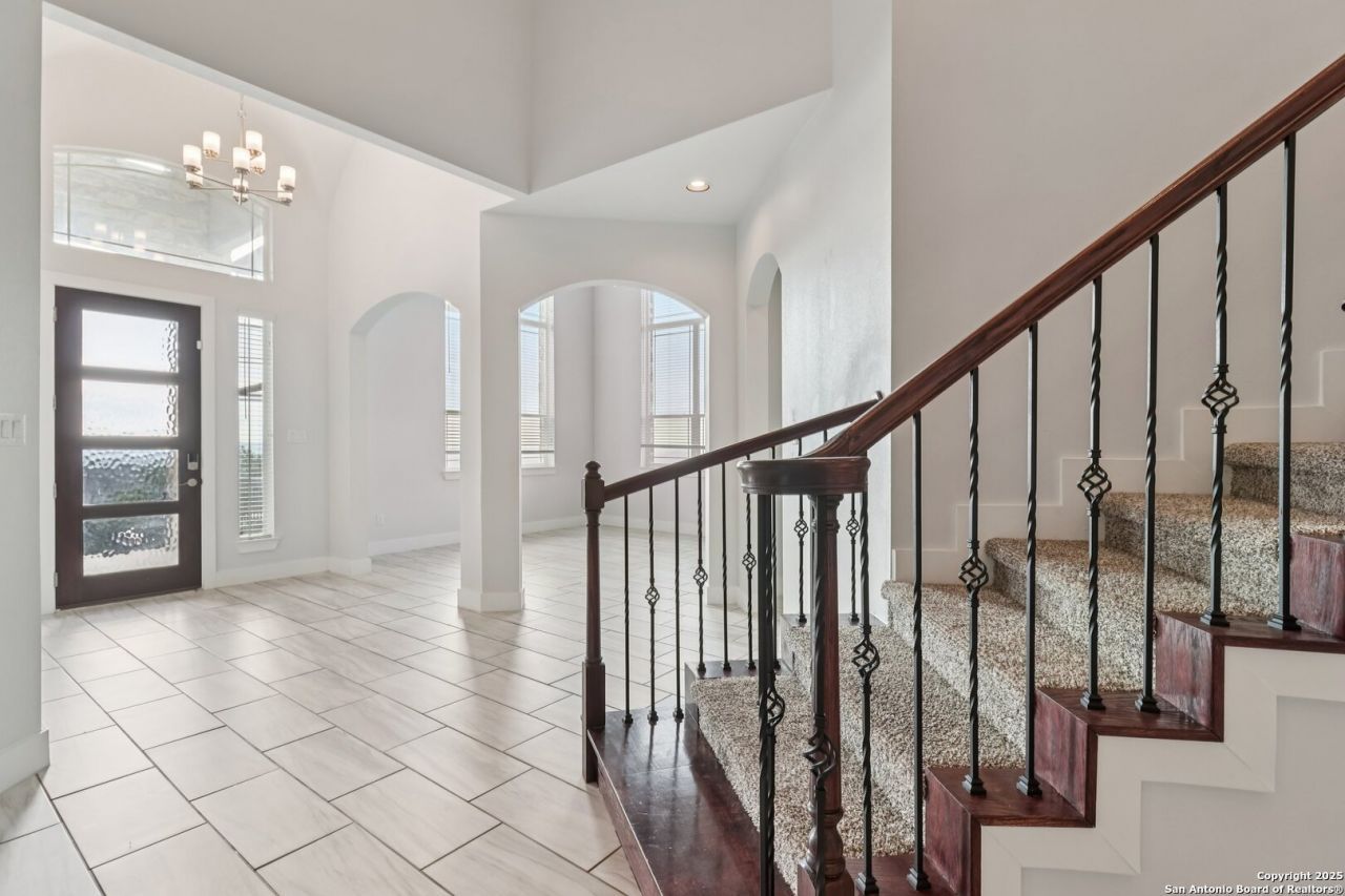 Welcome to 30137 Clover Pass, located in the sought-after Johnson Ranch Community-where Hill Country charm meets modern comfort. This impressive two-story home features 6 bedrooms, 5 bathrooms, and a beautifully flowing open-concept floorplan. The stunning stone exterior, dramatic elevated walkway, and towering entryway create a striking first impression, leading into a grand foyer with a wrap-around staircase and elegant architectural details. Inside, enjoy a gorgeous stone fireplace, a center kitchen island with upgraded lighting and finishes, and a formal dining room with built-in shelving. The spacious primary suite offers a spa-inspired bathroom with a garden tub, extended walk-in shower, and a custom walk-in closet. The fully fenced backyard provides a large covered patio, mature trees, no rear neighbors, and backs up to a greenbelt for added privacy. Community amenities include a resort-style pool, playground, and breathtaking Hill Country views.