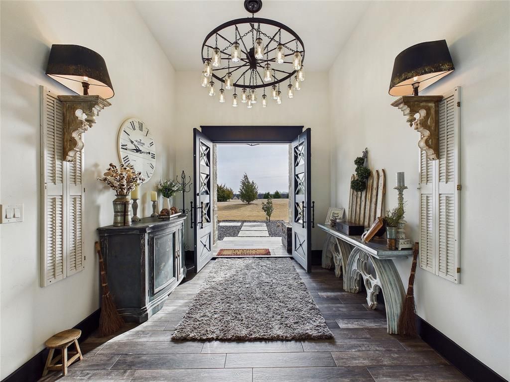 Sitting at the edge of Collin and Grayson County, this Contemporary Texas Modern Farmhouse rests on approximately 3.25 acres within a 2000+ acre Red Stag Ranch that has an enclave of larger acreage properties. When you drive the last 3 miles you will feel you are in the Texas Hill Country. Intentionally situated away from the pace of city life, the homestead offers open land, wide skies, and the kind of quiet only found where space and sky outnumber rooftops.Approaching the homestead, open acreage gives way to a walking path framed by black obsidian aggregate that leads to handcrafted Entrada 8' double iron front doors, creating a calm and intentional arrival.Inside, the heart of the home centers around a floor to ceiling wood burning fireplace constructed of Silvermist chopped stone with custom live edge cedar mantels. The open living spaces are complemented by custom lighting crafted from reclaimed materials, including wagon wheels sourced from McKinney & Canton Trade Days.The chef’s kitchen features Shadow Storm Brazilian marble countertops, including a single slab leathered island, honed perimeter counters, extensive storage, and a cabinet lined pantry designed to maintain a clean and organized space.The private primary wing includes an office, coffee bar, laundry access, and a spa inspired bathroom with radiant heated floors, oversized soaking tub, and a dual access slate shower with rain head, body sprays, and multiple fixtures.Additional features include a secondary suite with heated bathroom floors, walk in closets throughout, a soundproof media room, upstairs laundry, spray foam insulation, tankless water heater, finished attic flex space, and a six car garage with an extra tall bay suitable for RV or boat storage.Blending handcrafted materials, reclaimed elements, and thoughtful design, this homestead offers a modern interpretation of the Texas farmhouse.