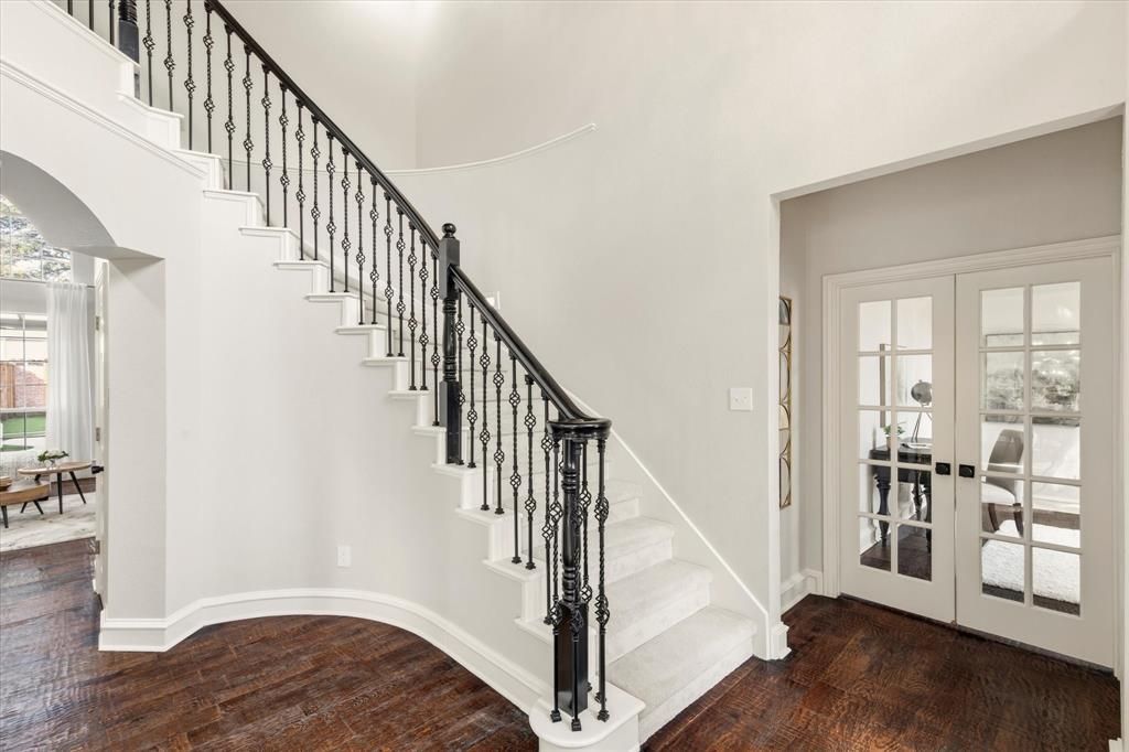 Discover this remarkable two-story traditional home, gracefully situated on a corner lot in the desirable Forest Creek North community. Spanning over 3,900 square feet, this entertainer’s dream perfectly blends style and functionality. An elegant foyer with soaring vaulted ceilings and sweeping hardwood floors welcomes you inside, flanked by formal living and dining rooms just off the entry. Continue into the open-concept living area, centered around a stunning gas fireplace with a modern tile surround and wood-beam mantel. Walls of windows showcase views of the sparkling pool and fill the space with natural light. The gourmet kitchen is a chef’s dream, featuring granite countertops, KitchenAid stainless steel appliances—including a beverage refrigerator—a five-burner gas cooktop, center island, abundant prep space, and a large walk-in pantry. The primary suite is thoughtfully positioned on the first floor and offers a cozy sitting area with tranquil pool views. The luxurious ensuite bath includes dual vanities, a jetted soaking tub, separate shower, walk-in closet with a custom organization system, and an additional cedar walk-in closet. A versatile flex space on the main level, complete with a walk-in closet, can serve as a fifth bedroom or home office. A curved wrought-iron staircase leads to the second floor, where you’ll find three spacious bedrooms, two full baths, and a bonus room ideal for a game or media room. Step outside to your private backyard retreat, complete with a covered pergola, Coyote grill, turf grass, and a sparkling pool—an outdoor oasis you’ll never want to leave. Conveniently located with easy access to major highways, shopping, dining, and entertainment.