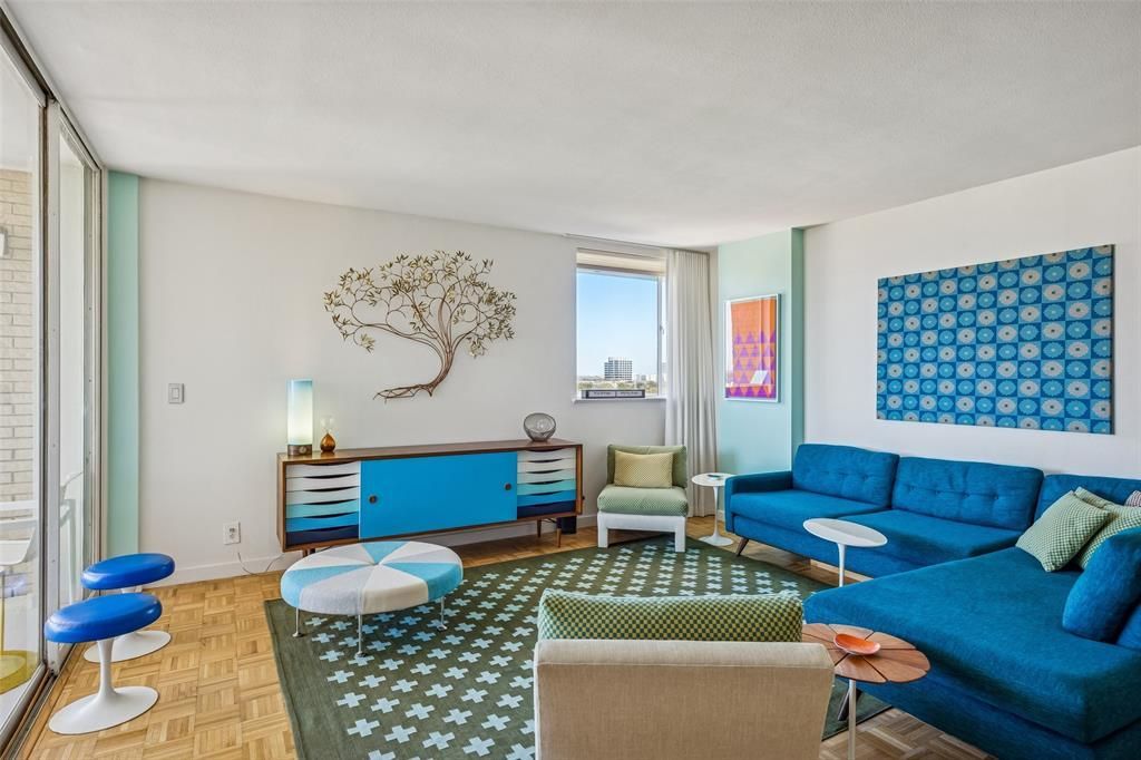 Positioned on the coveted 12th floor — the building’s sub-penthouse level — at Turtle Creek North, this rare corner residence captures the tailored glamour of the early 1960s with cinematic North facing Highland Park views. Updated in 2022 with stylistic sensitivity to its mid-century roots, the home blends old and new seamlessly. Original parquet wood floors grace the formal living and dining spaces, while walls of glass flood the residence with natural light, with Highland Park and Turtle Creek exposures. The stunning kitchen makes a bold statement with quartz countertops, stainless appliances, dramatic backsplash, and floating shelves. Thoughtful nods to the past add personality — including a snazzy built-in Caloric Telephone Caddie and subtle retro-inspired details that honor the building’s 1962 heritage. The bath continues the story with classic penny tile and elevated finishes that feel modern, yet subtly nostalgic. Custom blackout blinds and a state-of-the-art ($8,000) smart lighting system provide modern comfort and control throughout. Built during Dallas’ golden age of mid-century modern living, Turtle Creek North was designed for the cosmopolitan lifestyle of the era — when service, sophistication, and location defined luxury. That same spirit of elevated living continues today, complemented by full lobby service, on-site management, and an inviting courtyard pool that feels more Riviera retreat than routine. Just steps from the Katy Trail, Turtle Creek Park, Uptown dining, and Knox-Henderson retail, the lifestyle is walkable, sophisticated, and quietly iconic. Monthly dues cover electric, water, trash, maintenance, and blanket insurance — a rare convenience that may have you feeling like your budget has traveled back in time. One more thing...if you happen to run into Don Draper in the lobby, pour a highball and raise a glass — just be sure to skip the cigarette… it is 2026, after all!