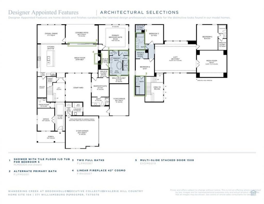 The Valerie home design built by Toll Brothers is a stunning blend of elegant indoor and outdoor living spaces. An inviting foyer ushers past a lovely office into the spacious great room, complete with a cozy fireplace. Adjacent to a bright, casual dining space with access to a beautiful covered patio, the kitchen is a chefs delight, offering an expansive center island with a breakfast bar, a large walk-in pantry, and generous counter and cabinet space. Accented by a gorgeous tray ceiling, the primary bedroom features dual walk-in closets and a tranquil bath with a tray ceiling, dual vanities, a luxe shower, a relaxing soaking tub, and a private water closet. A first-floor bedroom suite is ideal for guests. Central to an expansive loft is a secondary bedroom suite with a walk-in closet and two secondary bedrooms with walk-in closets. Other highlights include a peaceful courtyard, a first-floor powder room and laundry area, and a versatile media room. Disclaimer: Photos are images only and should not be relied upon to confirm applicable features.