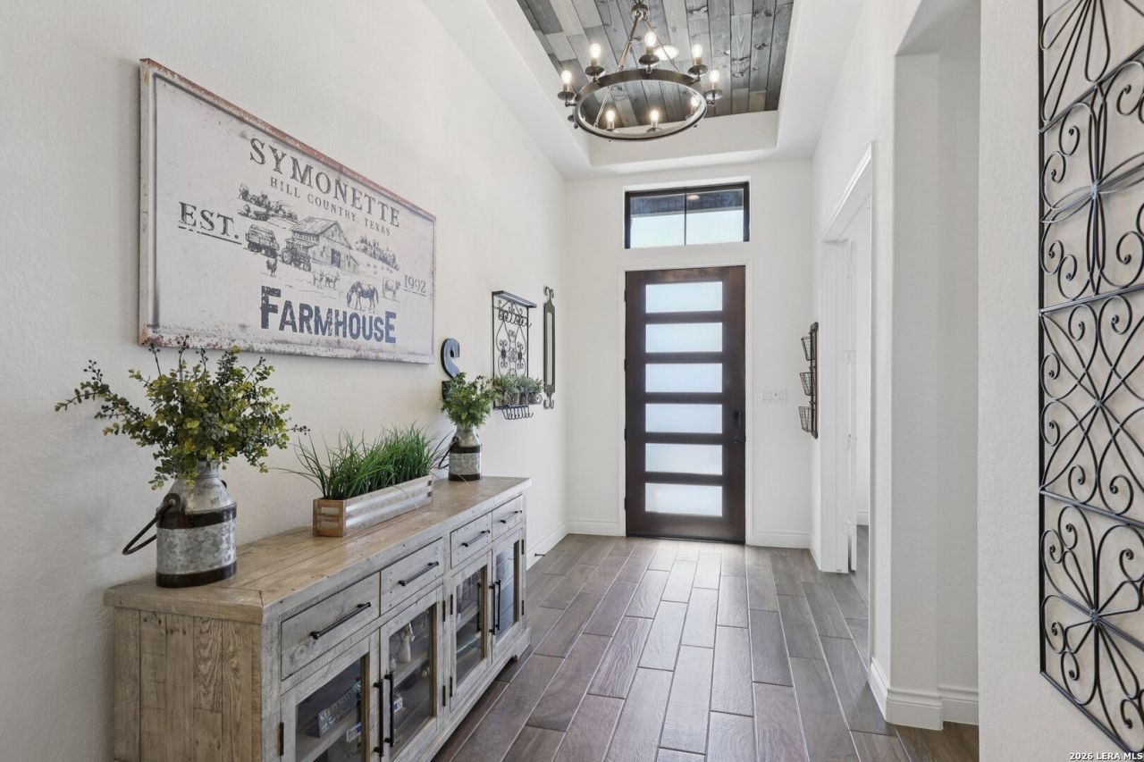 Welcome to one of the most upgraded homes you will find on the market in Bulverde, TX. This stunning one story luxury home offers more than 3,300 square feet of thoughtfully designed living space and features 4 spacious bedrooms, 3 full bathrooms, a private study, a dedicated media room, and a breathtaking screened in outdoor living area that allows you to enjoy the beauty of Texas Hill Country living year round. From the moment you walk inside, the attention to detail and high end upgrades immediately stand out. The open concept living room features soaring vaulted ceilings with beautiful wood wrapped beams and a dramatic floor to ceiling stone fireplace that creates a warm and inviting centerpiece for the home. Gorgeous wood look tile flows throughout the main living areas and the primary suite, offering both durability and style, while plush carpet is reserved for the secondary bedrooms for added comfort. The kitchen is truly a showstopper and designed for both entertaining and everyday living. Beautiful upgraded granite countertops pair perfectly with the striking two tone cabinetry, featuring crisp white upper cabinets and rich natural wood lowers. Cooking enthusiasts will love the built in double ovens, microwave, upgraded five burner gas cooktop, pot filler, and the incredible amount of cabinet storage including an additional row of upper cabinets for maximum functionality. Massive sliding glass doors open from the living room to one of the most impressive outdoor living spaces you will find. The vaulted covered patio leads into a large screened in porch that allows you to enjoy the outdoors while staying comfortable in every season. A gas stub out is already in place for a future outdoor kitchen, and an additional patio slab provides even more room for entertaining. Mature oak trees in the backyard create a peaceful and private setting that truly captures the charm of Texas living. The primary suite is a private retreat featuring vaulted ceilings, beautiful wood beam accents, and large windows that bring in abundant natural light and relaxing views of the backyard. The spa inspired primary bathroom is designed to impress with a freestanding soaking tub positioned against a custom tiled accent wall, double vanities, a dedicated makeup vanity, and an oversized walk in shower tiled to the ceiling with multiple shower heads including a luxurious rain shower. Even better, the suite includes two spacious walk in closets. Movie nights will never be the same thanks to the incredible media room, complete with a projector, surround sound system, and remote controlled blackout shades that convey with the home to create a true in home theater experience. The secondary bedrooms are generously sized and offer walk in closets and upgraded ceiling fans, while the secondary bathrooms feature beautifully designed walk in showers tiled to the ceiling for a truly luxurious feel. For those who work from home or need a quiet space, the private study features