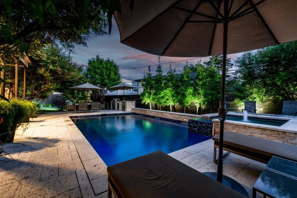 Set in the heart of one of Dallas’ most desirable neighborhoods, this home brings together thoughtful modern design, resort-quality outdoor spaces, and an effortless single-story layout that’s built for both everyday living and entertaining. Inside, the open concept floor plan is anchored by wide-plank white oak hardwood flooring, recently refinished in May 2025, and lined with oversized windows that flood each room with natural light. Four spacious bedrooms, each with a private en suite bath, offer comfort and privacy, while a separate media room and dedicated bar with built-in wine room make this home equally suited for lively gatherings or quiet evenings at home. Every detail was designed to elevate the living experience—from the architectural flow of the main spaces to the finishes that bring warmth and style throughout. Step outside to a backyard that truly impresses: an expansive covered patio overlooks the sparkling saltwater pool with cascading waterfalls, spa, and a linear gas fireplace that invites year-round enjoyment. The outdoor kitchen is fully equipped for dining and entertaining, framed by lush landscaping that creates a true sense of privacy and escape. Whether hosting a crowd or simply unwinding at the end of the day, this backyard feels like your own personal resort. Located in the heart of Midway Hollow, with unbeatable access to the best dining, shopping, and amenities Dallas has to offer, this is a home that delivers at every turn.One or more photos were virtually staged*