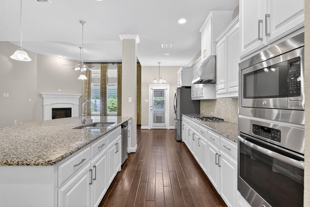 Beautiful Single-Story Home!This thoughtfully designed single-story home in the desirable Harvest community features wood flooring from the entry and throughout the main living areas and kitchen.At the heart of the home is an expansive kitchen with a large granite island, gas cooktop with stainless steel vent hood, stainless steel appliances, and an abundance of cabinetry. The kitchen flows seamlessly into the living room, which is filled with natural light from large windows and anchored by a charming fireplace.The oversized breakfast area includes a built-in buffet and is staged as a formal dining space, while the large formal dining room has been staged as a home office.The spacious primary suite features a generous en suite bath, walk-in closet, and convenient access to the laundry room, which loops back to the main hallway. A built-in mudroom leads to the two-car garage, and the secondary bedrooms are privately situated near the front of the home along with the second full bathroom.Enjoy outdoor living under the covered patio with a wooden privacy screen. A full stairway in the garage leads to a large 21' x 18' unfinished bonus room ideal for storage or future expansion.Harvest HOA includes resort-style amenities including a fitness center, multiple pools, dog park, event lawn, and community farm!
