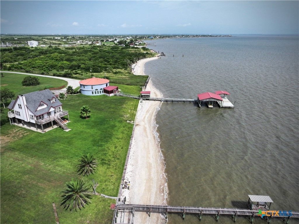 MAGNOLIA BEACH WATERFRONT! This property consists of a distinctive contemporary round 4 bedroom, 3 bathroom home with a pier with 2 covered slips and a boat lift, 175 of waterfront with a concrete bulkhead, and a spectacular view of Lavaca Bay. It also has a large metal building with 5 metal roll up doors and a gameroom, covered pavilion, 8 RV pads and a playscape. Total area is 9.43 acres. Come take a look.