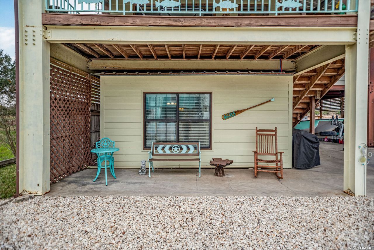 Fish, boat, relax, Stay! Your private Garcitas Creek getaway or full time paradise awaits! Enjoy coastal living in Industrial ISD within a private waterfront community featuring a boat ramp and pier on Garcitas Creek with direct access to Lavaca Bay. This well-maintained barndominium offers water views from the front deck and a flexible layout ideal for weekend escapes or full-time living. Designed with dual primary bedroom potential, the home includes a bedroom and bath on each level, plus a flex space on the main floor perfect for a third bedroom, or game room. A spiral staircase leads to the upstairs open-concept living, kitchen, and dining area, highlighted by rustic and beach-inspired finishes and an open, airy feel. Outside features include an oversized tandem carport for vehicles, a boat, or entertaining, Plenty of storage including two Morgan storage buildings (one climate controlled), and a fenced side yard for pets. A thoughtful, efficient design keeps the space bright, functional, and easy to enjoy, perfect for laid-back coastal living!
