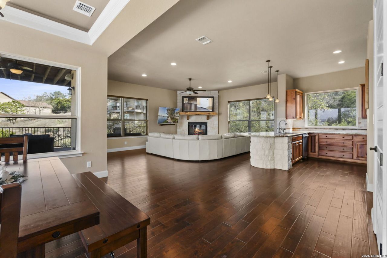 With a million dollar view as its focal point, 502 Cindy Dr is a .62 acre property delivers the lake lifestyle without compromise. Luxury finishes, a flexible multi level layout and turnkey furnishings create a rare offering on Canyon Lake for you to make this your dream lake house retreat or short term rental money maker! Airbnb short term rental is allowed by the HOA. You wait, you miss out! The fully furnished residence features 4 bedrooms and 3 full baths across 3,170 sqft. Highlighted by an open concept main level with living, dining and kitchen together for easy entertaining. Picturesque bay windows in the dining room give you an amazing view of the lake. Granite countertops and a huge frameless window over looking your backyard full of nature and no neighbors. Gas cooking is provided to the kitchen and outdoor grill by the propane tank located in the backyard. Youll also find a guest bedroom, full bath, office nook and laundry room on the main level. The third floor owners suite is a private haven with a covered wraparound balcony, a wet bar, a spa bath with an expansive walk in shower with two shower heads, a soaking tub and a huge custom closet. The primary bedroom has the same bay windows as the dining room giving you even more beautiful views of the lake right from your bed. The lower level adds two bedrooms connected by a Jack and Jill bath and a secondary living room / game room. One bedroom opens through glass doors to another covered wraparound balcony. 3 covered wraparound balconies in total. All weather resistant, create multiple outdoor living zones focused on a sweeping Canyon Lake panorama view. A 2 car garage is designed to house a boat and an extra large SUV. Installed in the kitchen sink is an Alkaviva vesta h2 water ionizer that makes alkaline or acidic hydrogen water. Advanced water softener included. The HOA provides a pool, tennis court, clubhouse and a boat ramp 6 minutes away.