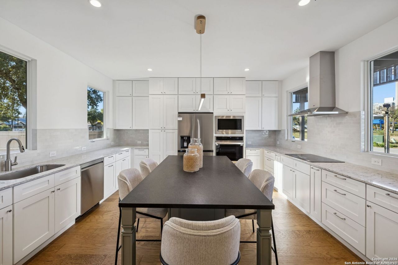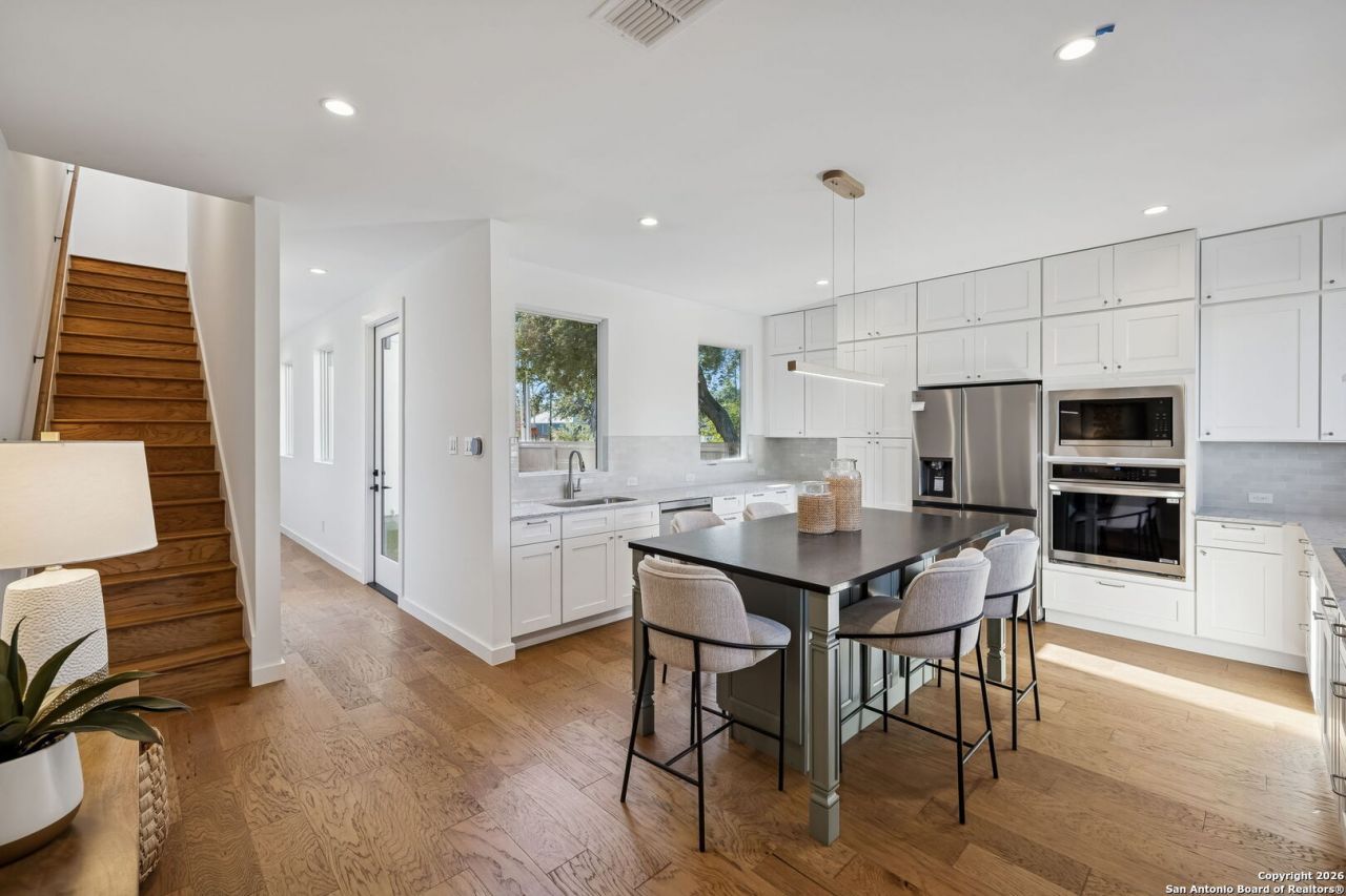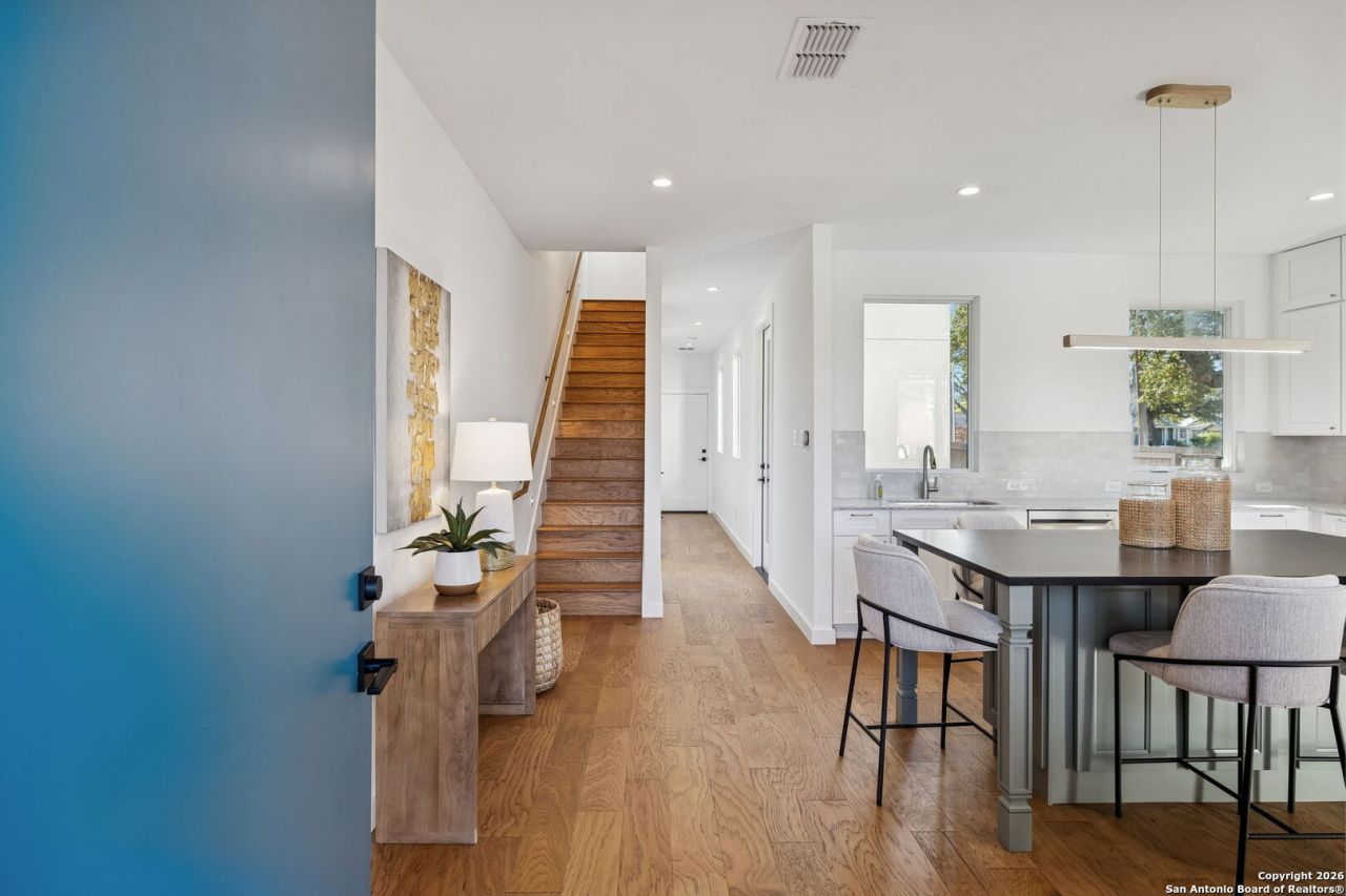 Experience modern urban living in San Antonios Southtown / Lavaca district. This three-story garden home by award-winning CVF Homes is located near Downtown, the Pearl, Hemisfair Park, the Alamodome, the Southtown Strip, and the planned Spurs arena and Project Marvel. Labor Street Park and Dog Park are located directly across the street. The residence features a private, low-maintenance courtyard, a thoughtfully designed kitchen with sleek finishes and stainless steel appliances, and a third-level primary suite with a dedicated coffee bar, walk-in closet, spa-inspired bath, and private balcony with views of the Tower of the Americas. Energy efficiency and technology are highlighted by a 6.56 kW solar energy system with a 13.5 kWh Tesla Powerwall battery, offering reduced utility costs and backup power capability. The built-in RIoT smart home system includes leak detection with automatic water shutoff, energy monitoring, air quality and room sensors, and a touchscreen control panel. Additional features include an optional elevator, attached two-car garage, and all appliances included, including LG washer and dryer. The home is Certified Zero Energy Ready, Energy Star, and Indoor AirPlus. Limited-time incentive: Seller is offering an interest rate buy-down, which may allow qualified buyers to obtain a 4.875% fixed interest rate, subject to lender approval and terms.