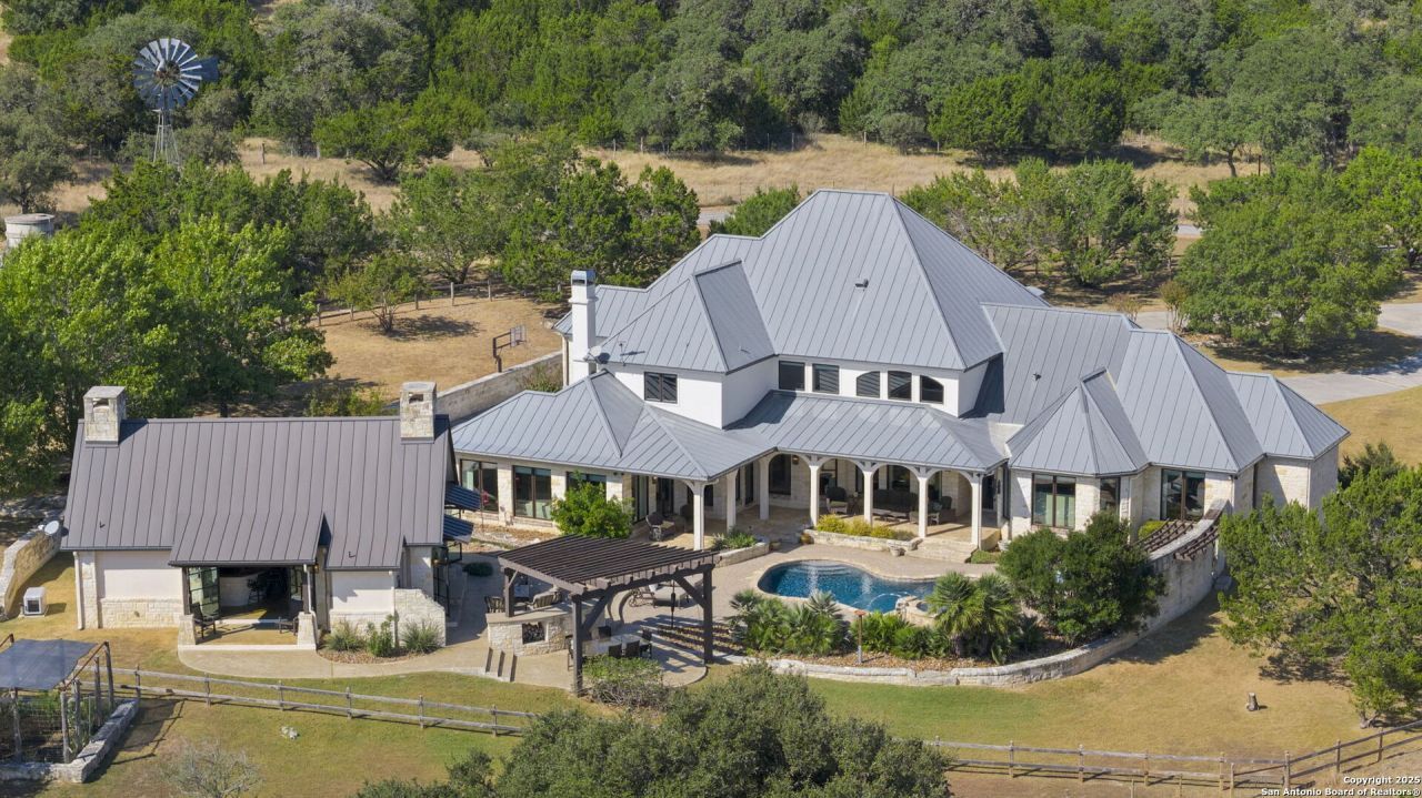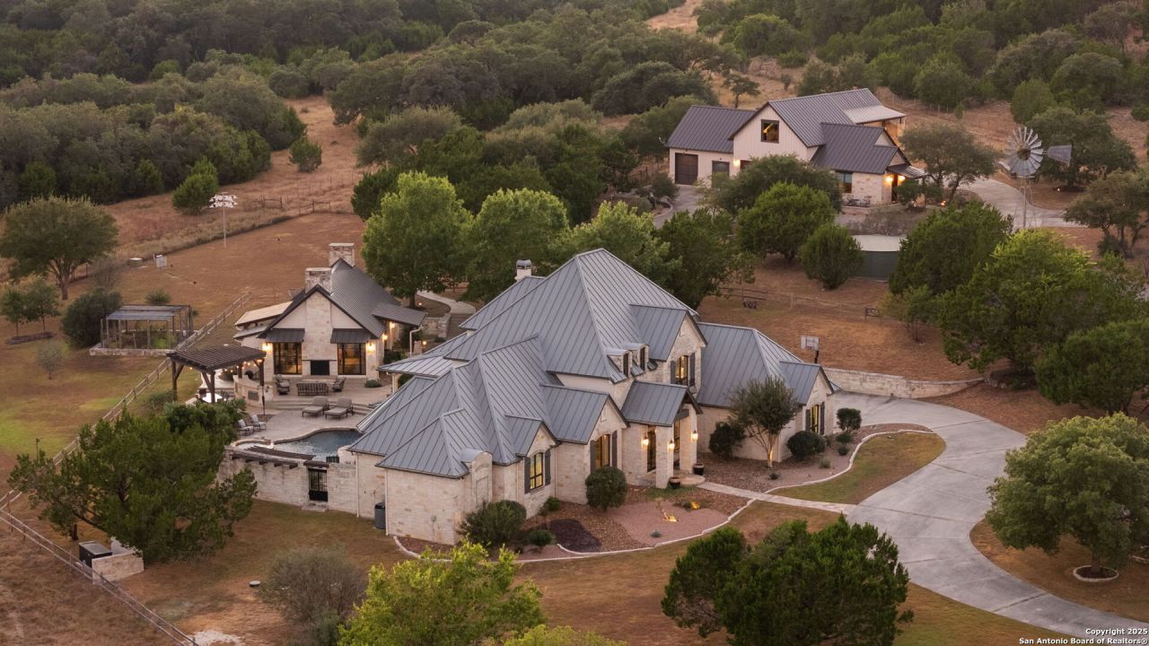 This remarkable 11.5 acre estate offers the utmost in sophisticated living with breathtaking views and a vast array of amenities. The property boasts a 5,472 sq.ft. main residence, a 1000 sq.ft. outdoor kitchen pavilion, a 975 sq.ft. garage loft, a 325 sq.ft. guest apartment, three custom horse stalls, and a luxury air-conditioned and heated dog kennels. Sustainable amenities include a 3,000-gallon holding tank, rainwater catchment system, whole-house generator, and a high performing well, all within a privately gated stone-and-iron entry with meandering drives. The custom home embodies timeless appeal combining luxury, functionality and Hill Country charm! No detail was overlooked when this property was designed! Upon entry, you are immediately taken aback by the views and the beauty of the interior! Two-story soaring ceilings to walls of seamless glass windows and transoms, arched entryways, distressed hardwood flooring, ornate chandeliers, furniture style cabinetry, Hunter Douglas shades and striking mouldings; this home has it all. The sprawling floor plan boasts a living room with a towering cathedral ceiling, a formal dining room, private study, game room and a grand flex room that can be tailored to fit your lifestyle. The culinarian is sure to appreciate the island kitchen that was perfectly designed to house all the quintessential cooking elements that one needs. The Viking 6-burner gas range with a double griddle and double ovens is complete with a striking stainless steel Vent-A-Hood. There is an abundance of custom cabinets, workspaces, beautiful backsplashes and a built-in side by side Sub-Zero refrigerator and freezer. For relaxed living, retreat to the grand family room that features a full wet bar, wine refrigerator, ice-maker and cigar humidor. The owners wing is a private sanctuary with a sitting room, outdoor access, and a spa-worthy bath boasting a freestanding Victoria Albert tub, elegant vanities with designer sconces, and a seamless glass walk-in shower with multiple shower heads and body jets. The custom wardrobe room features a packing island, dust-free cabinets and beautiful finishes making getting ready effortless and enjoyable. Completing the main residence are three secondary bedrooms and an attached two car garage. Once outdoors, you will be in awe of the sprawling grounds and amenities reminiscent of a luxury resort! Enjoy relaxing under the expansive covered patio, in front of the lodge style fireplace or dining under the pergola! When its time to cool down enjoy a swim in the pool or relaxing evenings in the spa! The soothing pool waterfall and gentle brook set a serene and peaceful ambiance. Adding to the allure of the backyard is the elaborate, one-of-a-kind, outdoor kitchen! Sets of double iron and glass doors open to create an airy and breezy kitchen! Features include a lounging area with a striking stone fireplace, sprawling wraparound sitting bar and a partial bath. The grill master will appreciat