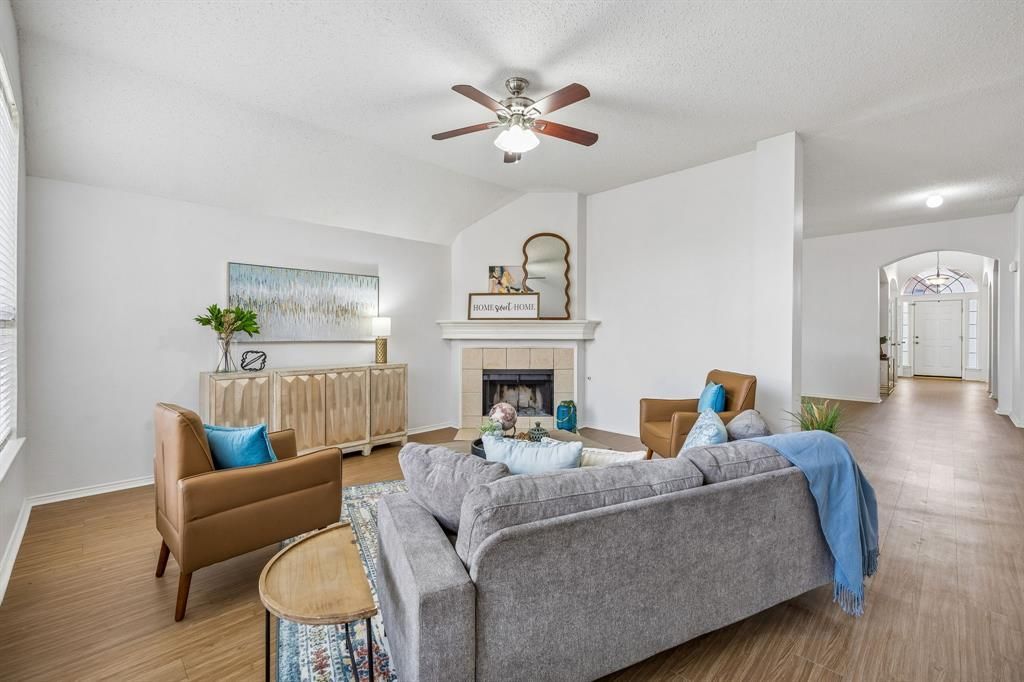 4 beds, 2 baths, and thoughtful updates throughout create a home that feels both spacious and refreshingly move-in ready. With soaring ceilings, multiple living areas, and recent improvements completed in 2025, this property blends comfort, functionality, and long-term peace of mind in a well-established neighborhood. The entire home boasts fresh paint, and newly installed luxury vinyl plank flooring flows through the main living spaces, bringing a clean, modern feel while offering reliable durability. Just off the entry, a flexible front room framed by French doors offers a natural place for a home office, reading room, or the 4th bedroom. Additionally, a formal living room has been walled in to create a large gameroom, play room, or 2nd living room. Continue through the home, and the layout opens into an expansive living and dining area where tall ceilings and oversized windows let natural light fill the space. Granite counters provide generous prep space, while a skylight above fills the room with natural light throughout the day. The open layout keeps the kitchen connected to the living spaces nearby. The primary suite offers impressive space and a peaceful retreat at the end of the day. A bay window sitting area adds charm and flexibility, while the ensuite bath includes dual vanities, a soaking tub, a separate shower, and the rare convenience of two walk-in closets. Secondary bedrooms feature newly installed carpet. Additional updates include a new back door, newly installed fencing, fresh sod in the yard, recently replaced siding, and gutter guards for added durability. Major systems have also been addressed with a 2023 HVAC system and water heater, helping to keep utility bills down. The neighborhood adds to the appeal with access to a community pool, park, and playground. Conveniently located just minutes from Loop 820, Highway 121, and I-35W, daily commutes and travel remain simple while shopping, dining, and everyday conveniences are close at hand.