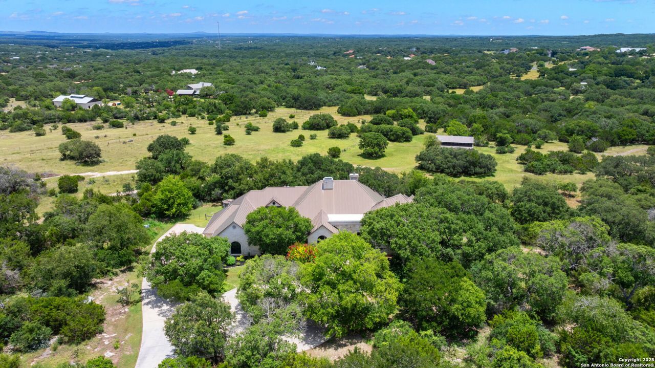 Discover this equestrian estate, nestled on 9.48 fully fenced and private acres with breathtaking views and a meticulously designed barndominium. This luxurious retreat offers both elegance and function, creating an unparalleled lifestyle experience. The custom residence showcases refined architectural details, including dramatic stone accent walls, a spacious great room with a striking fireplace, dual dining areas, and a private study that is perfect for working from home. The gourmet island kitchen is outfitted with imported Brazilian granite, Viking and Dacor appliances, gas cooking, three ovens, a warming drawer, vegetable sink, and custom knotted alderwood cabinetry. The thoughtfully designed space is ideal for entertaining and everyday living. The split owners retreat provides a private sanctuary, complete with outdoor access, a spa-inspired bath, dual vanities, Jacuzzi tub, and walk-in shower. Step outside to enjoy year-round relaxation on the expansive covered patio, which includes a stone fireplace, multiple lounging areas, a balcony, a sparkling pool with a tranquil water feature and serene hill country views. The grounds are perfectly designed for equestrian use, with mature trees and rolling pastures. The impressive 3,600-square-foot barndominium offers everything a horse enthusiast could desire, including: three custom horse stalls with interior/exterior Dutch doors, rubber matting, ceiling fans, Nelson automatic waterers, an interior wash stall, tack room, and feed/hay storage, a solid concrete aisle with rubber paver tiles and custom lighting. Finishing out this impressive barn is an apartment with a separate entrance, kitchenette and one car garage and a relaxing lounging deck with sweeping hill country views. This estate is the ultimate blend of luxury living and equestrian excellence. Square footage based on 4,578 square feet in the Main House and 450 square feet in the barn apartment. 4th bedroom and bathroom are the apartment. Master Transferable Golf Membership available for purchase.