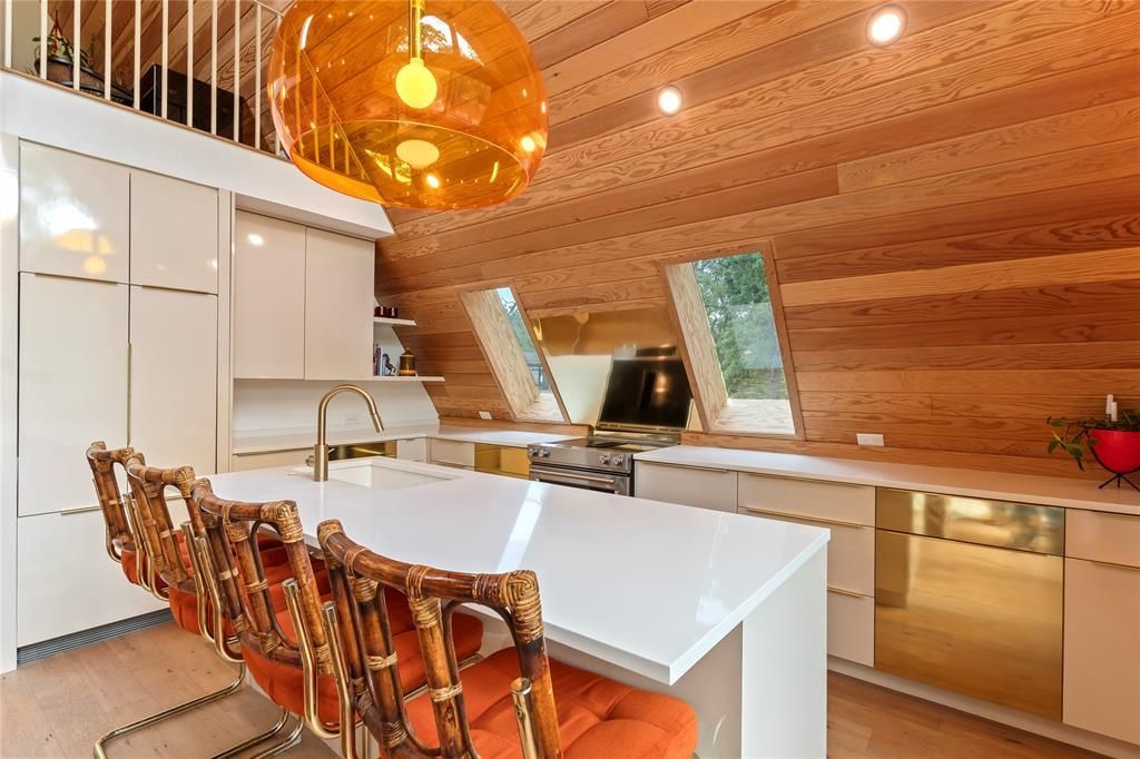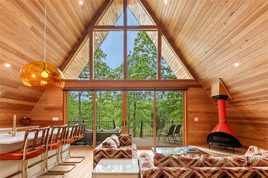 Stunning custom mid-century modern A-frame designed by Kim Lewis and built by Sabado Builders, nestled among mature trees in the lake community of Point La Vista. This architecturally striking home offers 3 bedrooms and 2 bathrooms and backs to a peaceful pond. The open-concept living area showcases dramatic 21-foot Douglas Fir wood ceilings and an expansive water-view window wall with 16-foot sliding patio doors, filling the home with natural light and framed by custom zebra blinds. The space is anchored by an imported vintage Preway wood-burning fireplace and complemented by built-in shelving, creating a warm and inviting focal point. The kitchen blends style and functionality with quartz countertops, bar seating, custom almond cabinetry, a stainless steel dishwasher and range, and panel front built-in Fisher & Paykel refrigerator, creating a seamless and modern aesthetic. The first floor features two bedrooms and a full bathroom with a walk-in shower and terrazzo tile, along with a conveniently located laundry area where the apartment-size washer and dryer convey. Upstairs, the primary suite features soaring ceilings, an ensuite bath with soaking tub, white terrazzo tile, custom windows blinds and an office nook on the landing—ideal for a workspace. Outside, enjoy a concrete driveway with covered parking, fenced side yard with pea gravel area, and tranquil pond views that enhance the home’s peaceful setting. Located in the Point La Vista lake community, residents enjoy amenities including a community pool, frisbee golf course, and boat dock with launch access to Cedar Creek Lake. This one-of-a-kind A-frame blends modern design, nature, and lake living, making it an ideal full-time residence, weekend retreat, or short-term rental opportunity packed with personality! Additional highlights include luxury vinyl plank flooring throughout, custom remote zebra blinds, four mini-split HVAC units, spray foam insulation, transferable starlink internet.