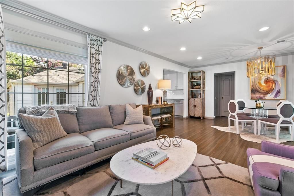 Beautifully renovated home offering an open-concept layout, designer finishes, and abundant natural light throughout. The spacious living area features hardwood floors, crown molding, and a cozy fireplace, flowing seamlessly into the dining space and chef’s kitchen. The kitchen is equipped with quartz countertops, custom cabinetry, stainless steel appliances, farmhouse sink, gas range, and a built-in beverage & wine station—perfect for entertaining.The primary suite provides a relaxing retreat with a spa-inspired bathroom showcasing a frameless glass shower and modern fixtures. Secondary bedrooms are generously sized, and a dedicated home office offers an ideal work-from-home setup.Enjoy a private backyard oasis with patio seating, string lighting, and manicured landscaping great for outdoor gatherings or quiet evenings.Located on a tree-lined street with easy access to shopping, dining, and major highways. Move-in ready and impeccably maintained.
