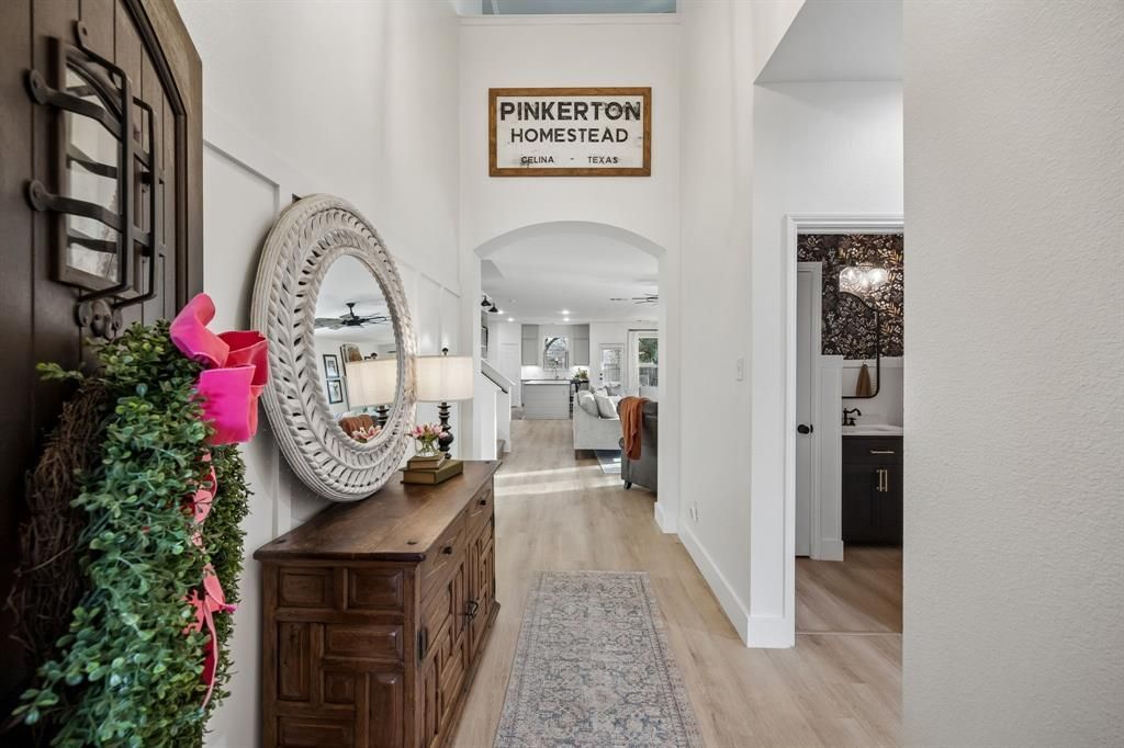In the vibrant Light Farms community, this extensively upgraded home stands out for its character and thoughtful design. Set on a corner lot backing to green space and mature trees, the backyard enjoys a more open feel with sweeping Texas sky views and added breathing room rarely found in the neighborhood. Inside, abundant natural light highlights new flooring and baseboards, fresh interior paint, designer lighting, and matte black hardware throughout. Custom millwork including board and batten accents, shiplap details, mud bench, and craftsman-style window trim add warmth and character. The living room is anchored by a lime-washed fireplace with custom trim, built-ins, and a poplar wood mantle, while the kitchen features custom island detailing, a built-in refrigerator surround, and upgraded cabinetry with pull-out storage. Bathrooms upgrades include but are not limited to tile shower surrounds, wallpaper, accent walls, and designer lighting. Additional highlights include a custom Murphy bed with built-in cabinetry, built-in bunk beds, updated ceiling fans, and attic storage. A new roof was installed in 2024. Outdoor living is just as inviting with a custom front porch swing, extended covered patio with pergola, landscape lighting, a dog run, and thoughtful landscaping. Life in Light Farms centers around connection and outdoor living, offering resort-style pools, a fitness center, tennis, pickleball, basketball, sand volleyball, stocked fishing ponds, a sand beach, dog park, miles of scenic trails, and more than 200 community events each year. This golf cart friendly community makes it easy to ride to Frontier Park for sports, as well as nearby restaurants, shopping, placing you in the center of everything you need while enjoying the feel of your own resort-style community. Residents also benefit from Prosper ISD schools, with Light Farms Elementary ranked among the top 300 elementary schools in DFW. This is a home that’s sure to impress!