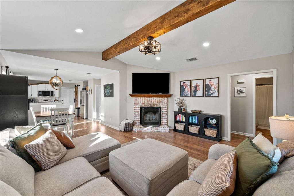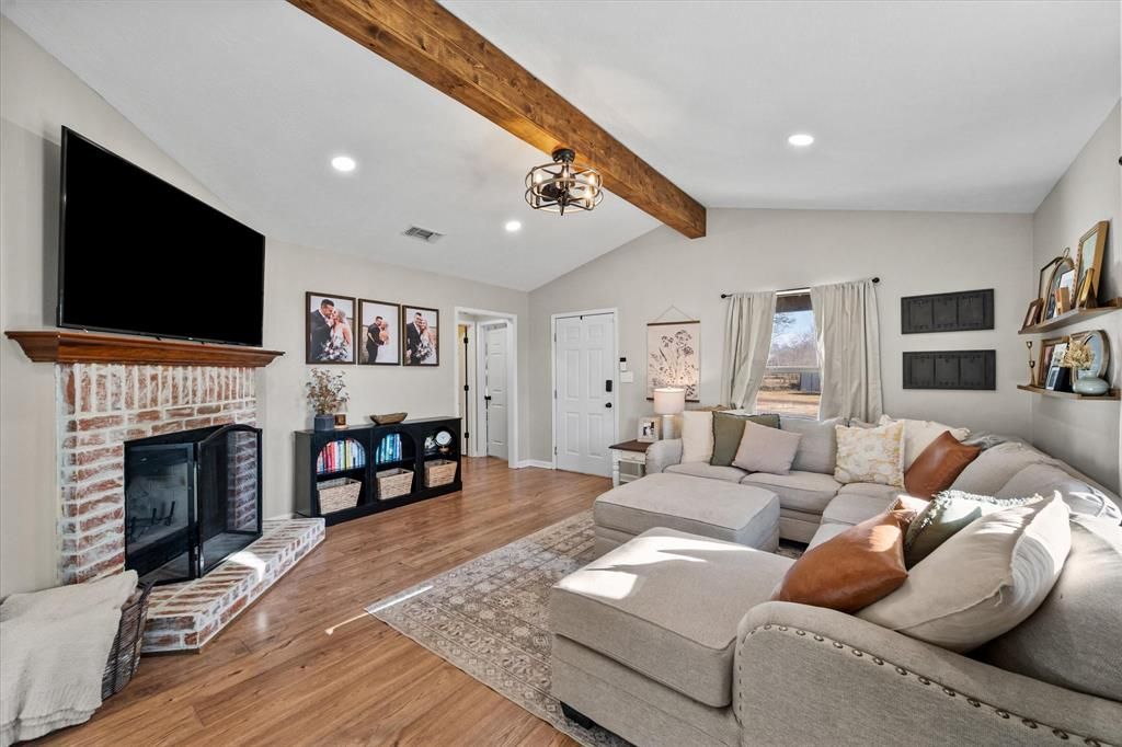 Charming country-style home situated on .8 acres in DEW ISD, offering the perfect blend of comfort, character, and room to roam. Step inside to a welcoming living room featuring vaulted ceilings with a beautiful exposed beam and a classic brick fireplace that anchors the space with warmth and style.The open-concept layout flows seamlessly from the living area into the dining space and kitchen—ideal for everyday living and entertaining. The kitchen shines with gorgeous granite countertops, a feature carried throughout the home for a cohesive, upscale touch.This home offers 3 bedrooms and 2 bathrooms, including a relaxing primary suite with a private ensuite bathroom. Each space feels thoughtfully designed with plenty of natural light and charming details throughout.Outside, enjoy a large backyard with ample space to run, play, garden, or simply relax, all while enjoying the peace of a country setting. With its inviting features, open layout, and generous lot size, this property is ready to be called home.